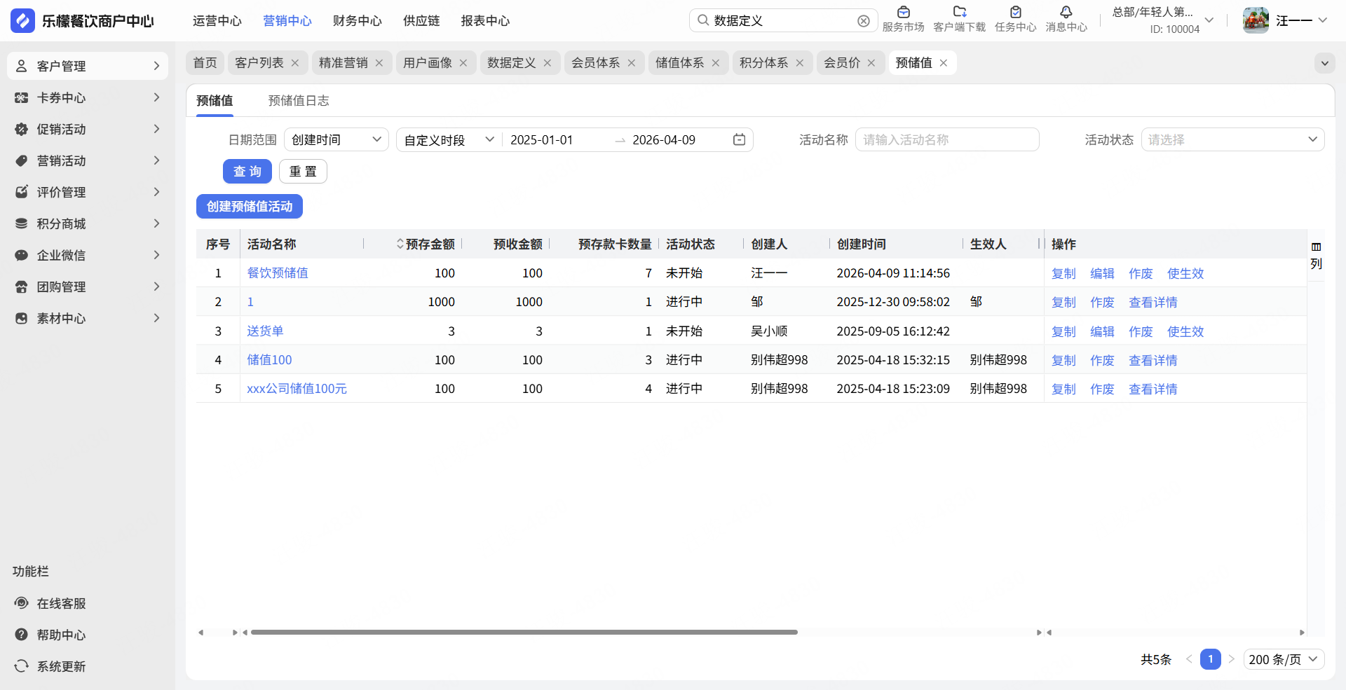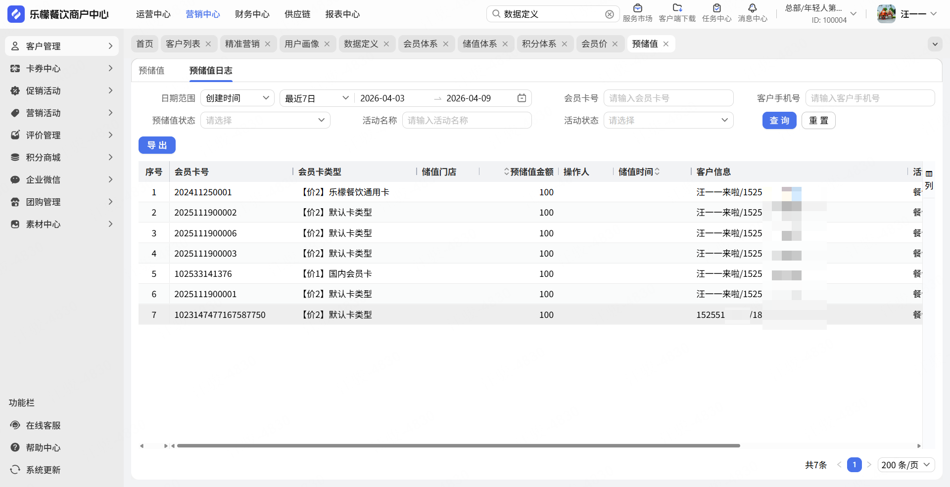 👉【操作路径】:打开【乐檬餐饮商户中心】 ,依次点击:营销中心-客户管理-预储值