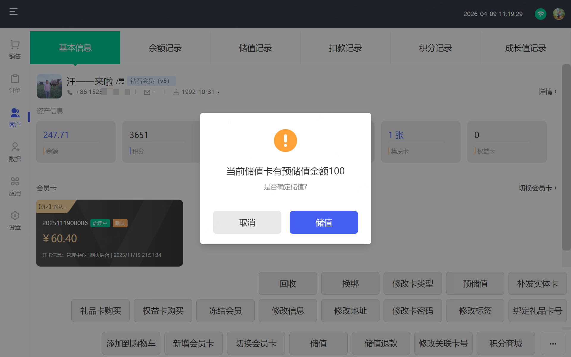 后台调整客户会员卡余额提示商户未允许自定义金额充值