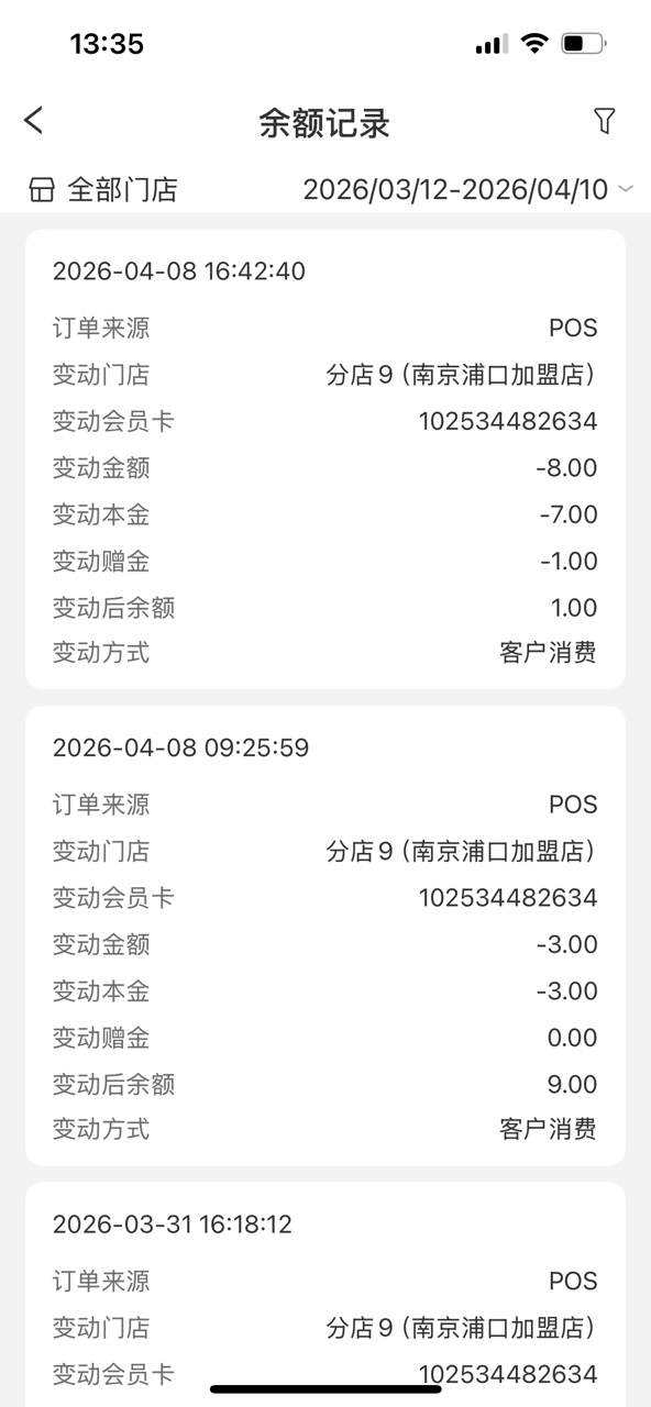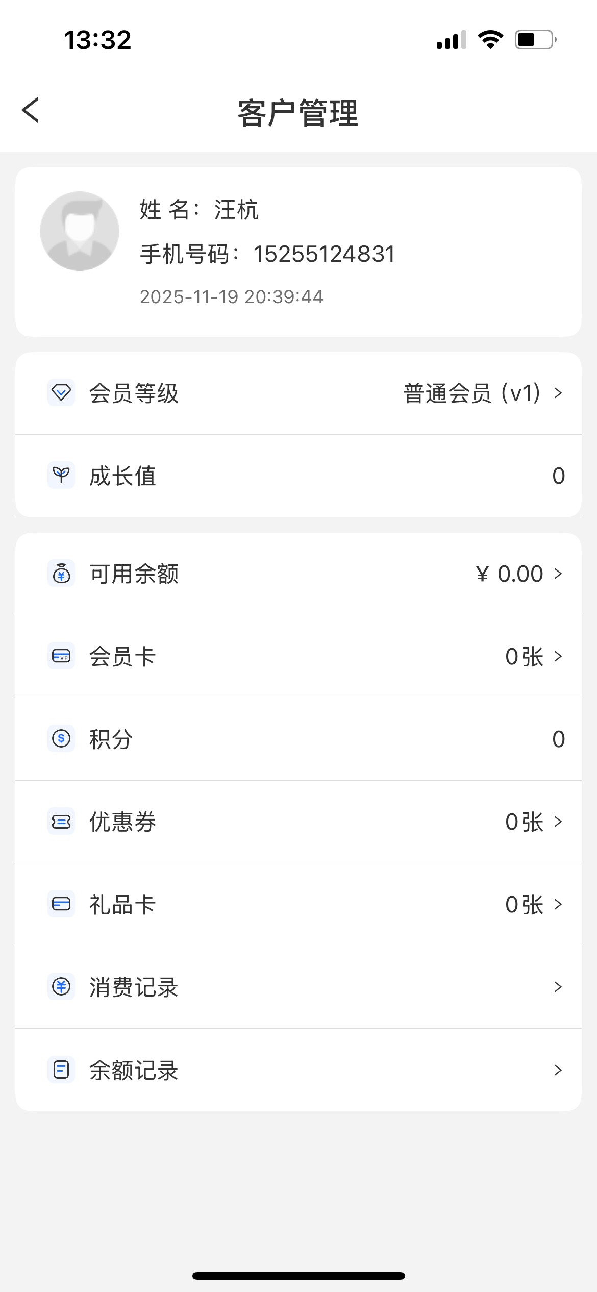 输入手机号查询后,可查看会员信息,包括会员等级、优惠券、礼品卡、消费记录、余额记录