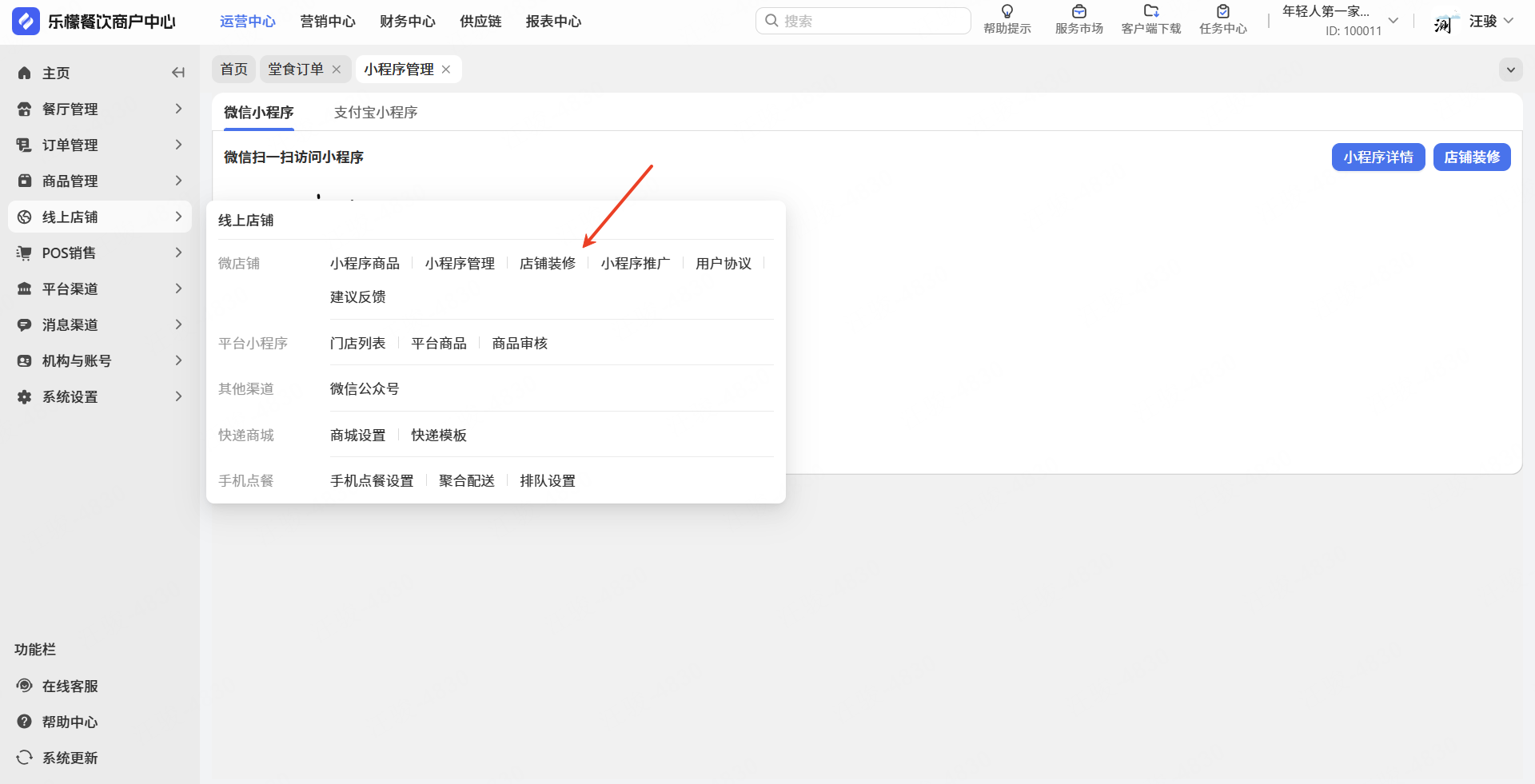 👉【操作路径】:进入WEB端【乐檬餐饮商户中心后台】,依次点击①【运营中心-②【线上店铺】】-③【店铺装修】-跳转店铺装修页