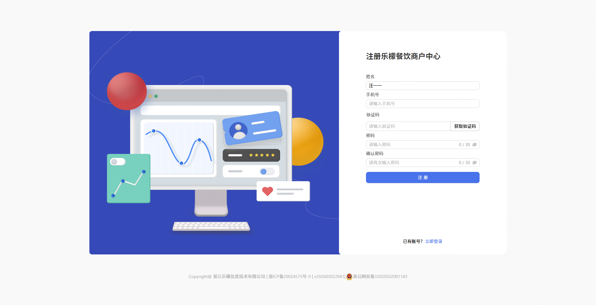 依次点击:①输入后台网页地址-②点击立即注册去注册账号-③依次填写相关信息进行注册