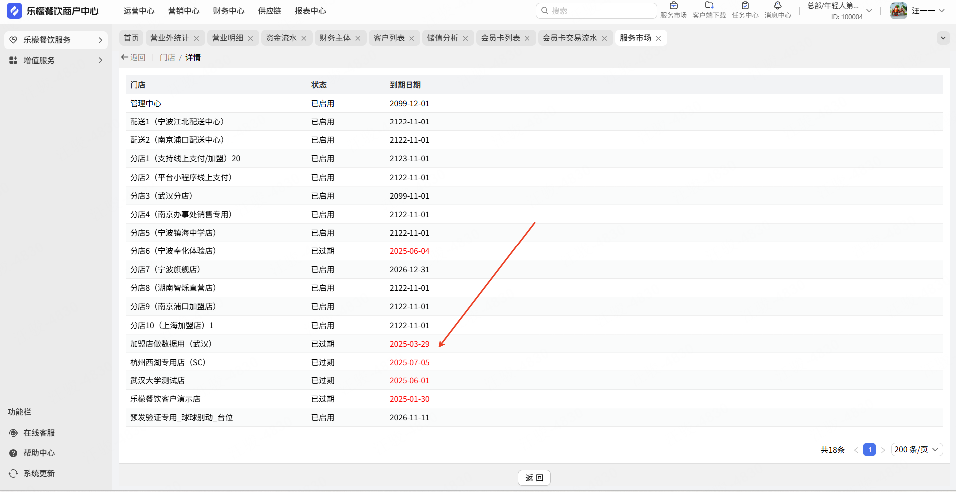 👉【操作路径】:①查看门店详情,查看门店到期日期