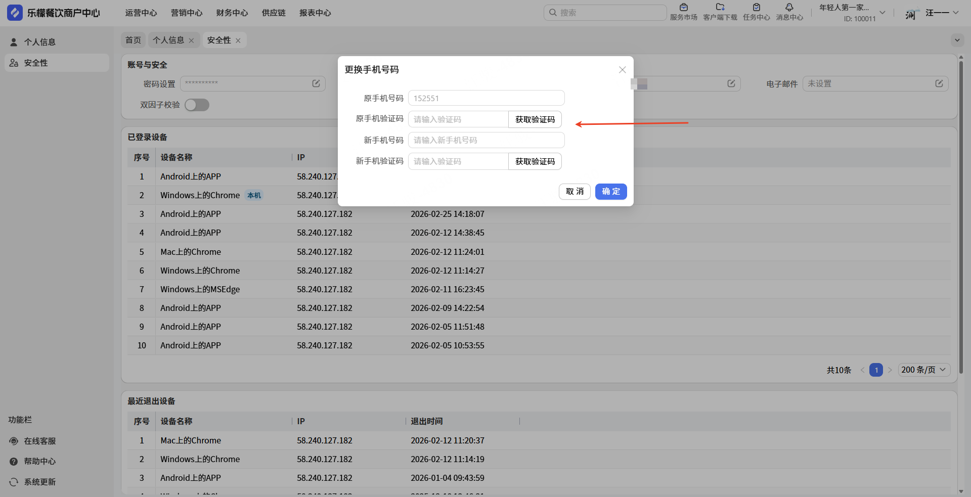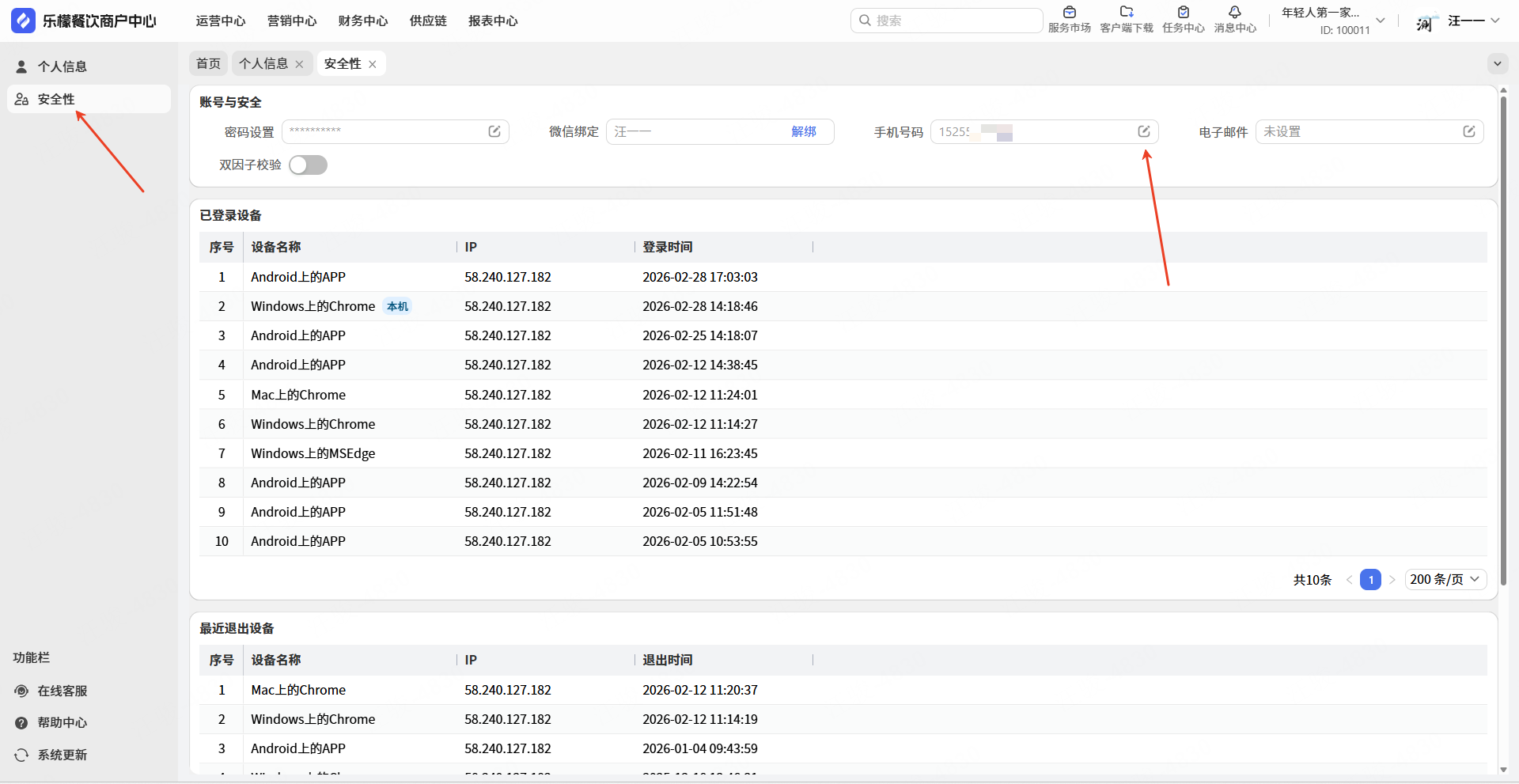 👉【操作路径】:1.绑定手机号:打开【WEB端(乐檬餐饮商户中心后台)】,依次点击:①点击管理乐檬餐饮账号-②点击安全性-③ 编辑手机号码-④输入新的手机号,输入老手机号/新手机号验证码