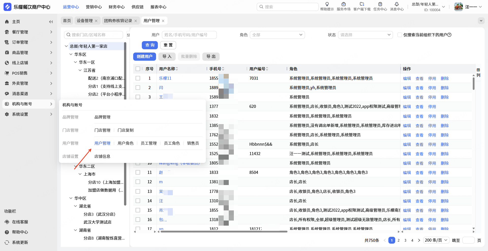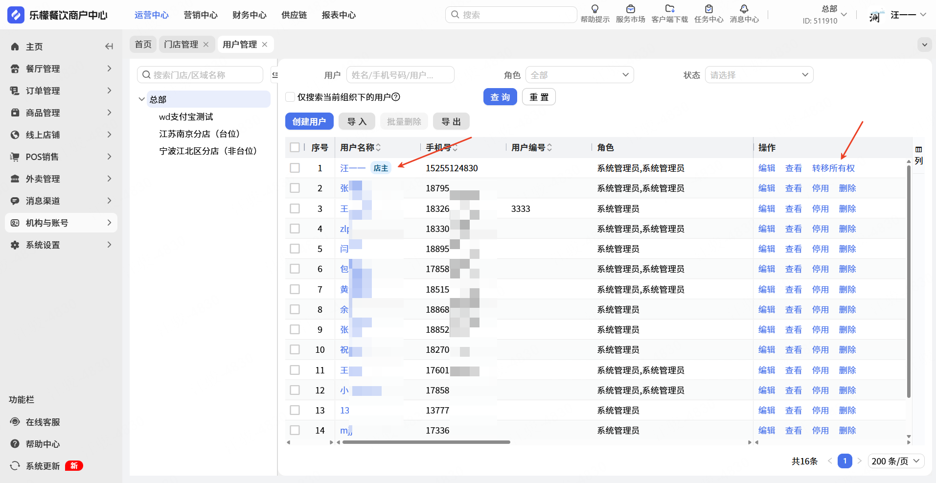 2.变更管理员:打开【WEB端(乐檬餐饮商户中心后台)】依次点击👉【操作路径】:①点击机构与账号-用户管理