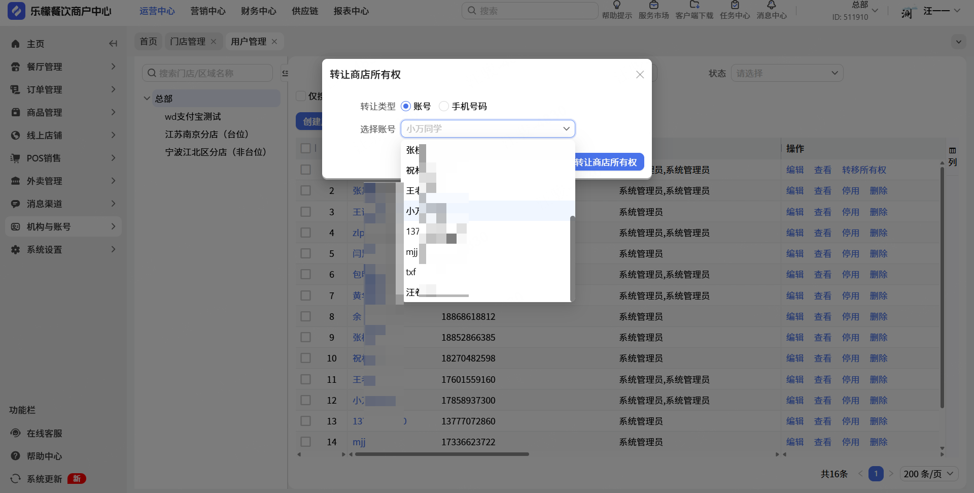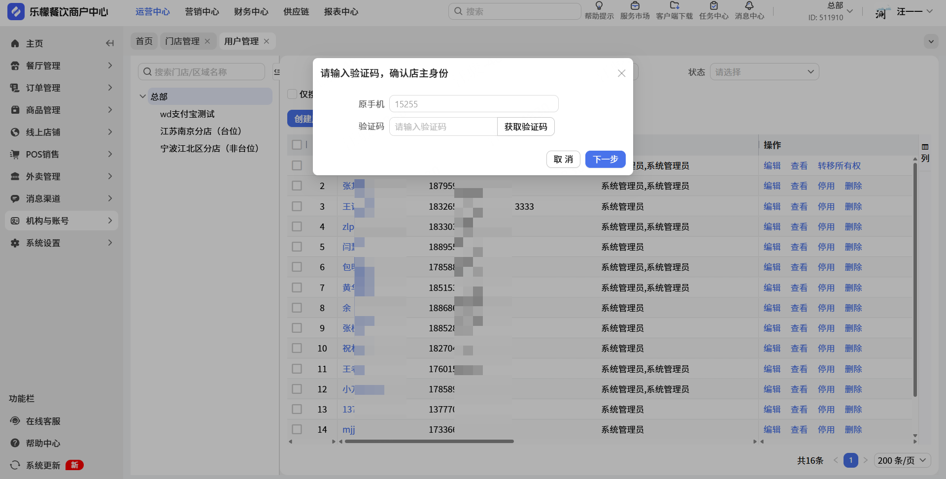 注意:1.如果一个手机号绑定了多个门店/店铺,那么操作变更绑定手机号时所有门店都会同步修改。