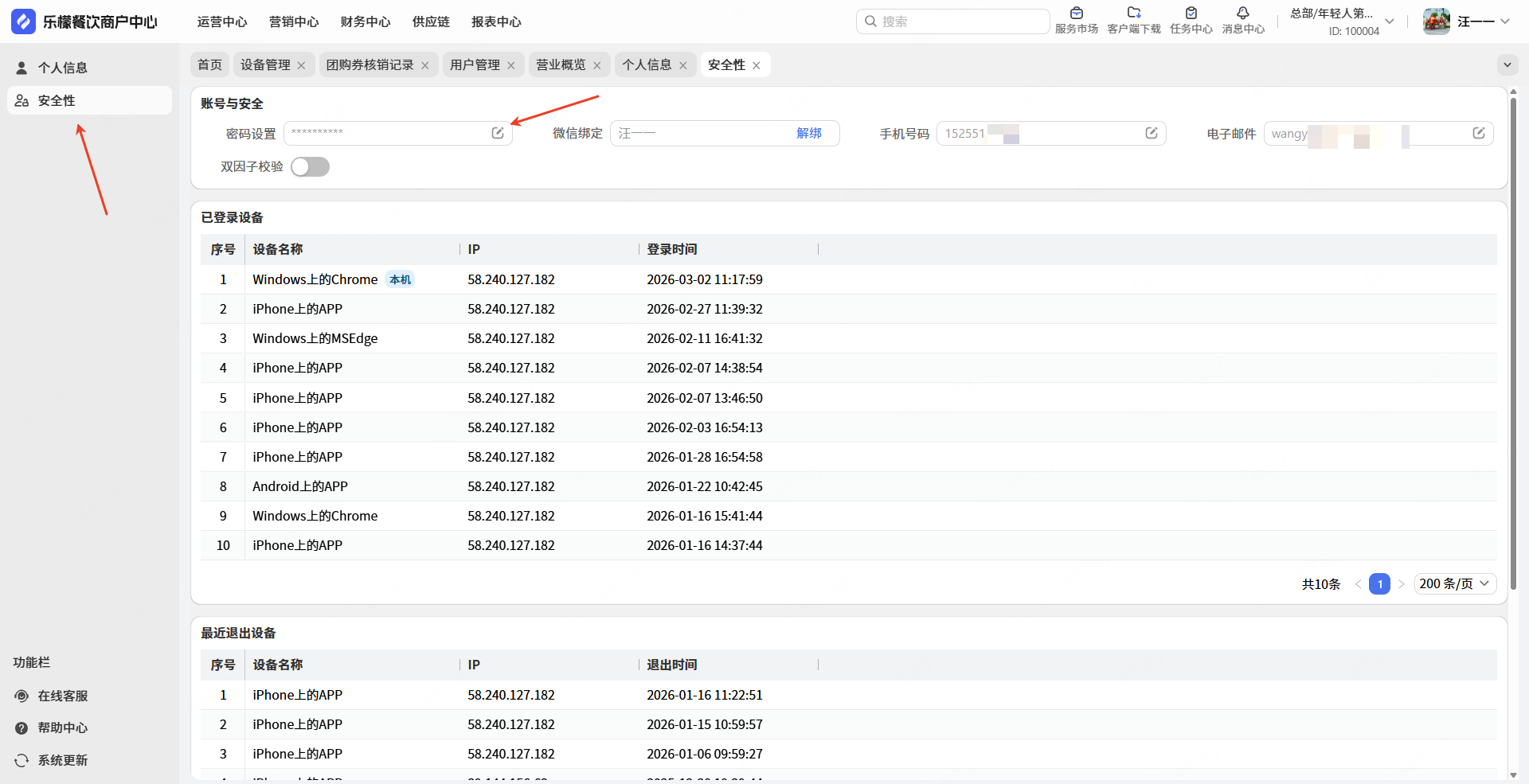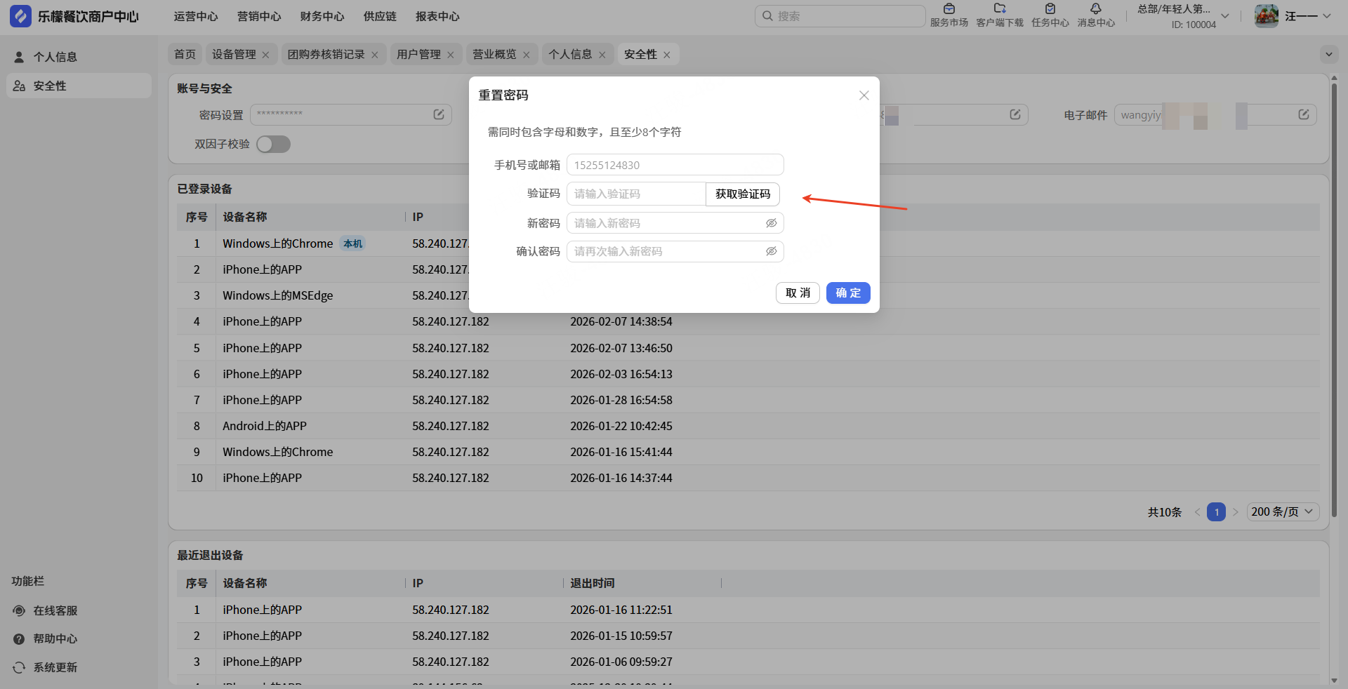 👉【操作路径】:1.修改登录后台的密码:打开【WEB端(乐檬餐饮商户中心后台)】,依次点击:①点击管理乐檬餐饮账号-②点击安全性-③编辑密码设置④输入新的密码,点击确定