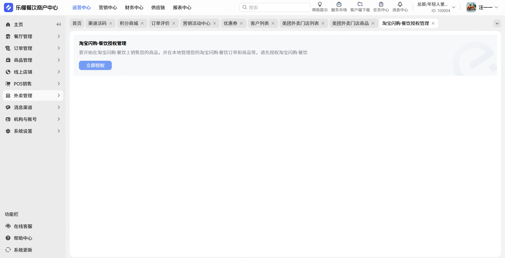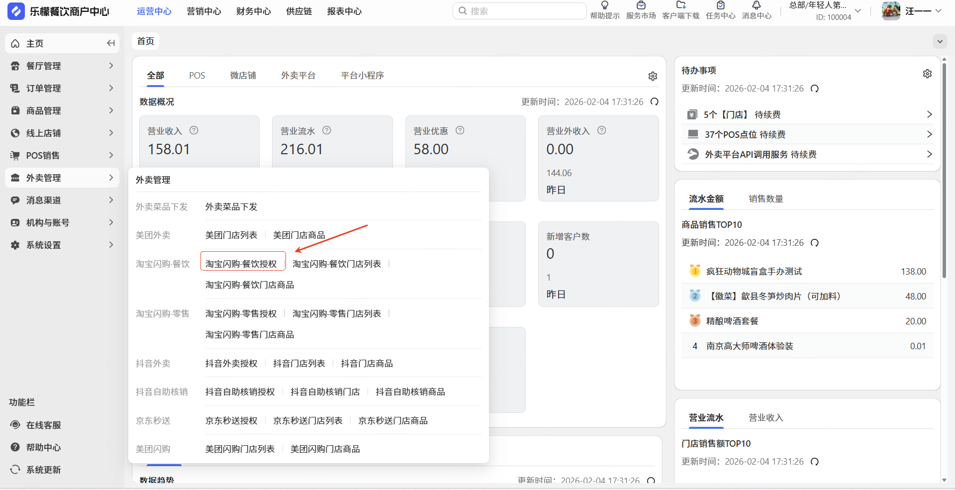 👉【操作路径】:打开【乐檬餐饮商户中心】】或在收银POS端-左侧-导航栏-后台系统),依次点击:①外卖管理-②淘宝闪购.餐饮③点击立即授权