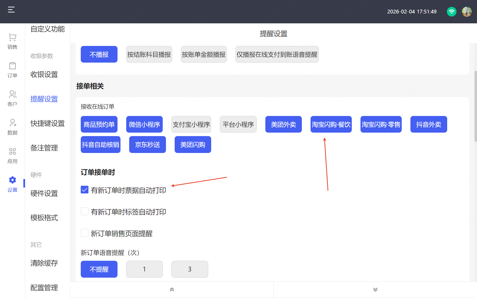 POS前台开启接受淘宝闪购.餐饮订单并自动打印票据