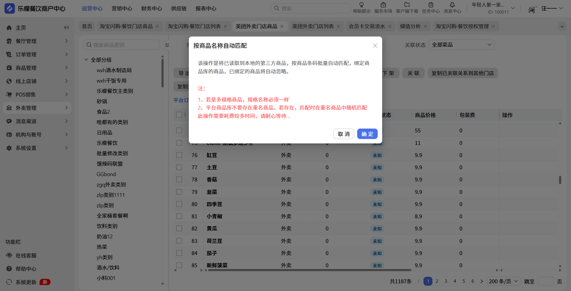 注意:该操作是将已读取到本地的第三方商品,按商品名称批量自动匹配,绑定商品库的商品,已绑定的商品将自动忽略。