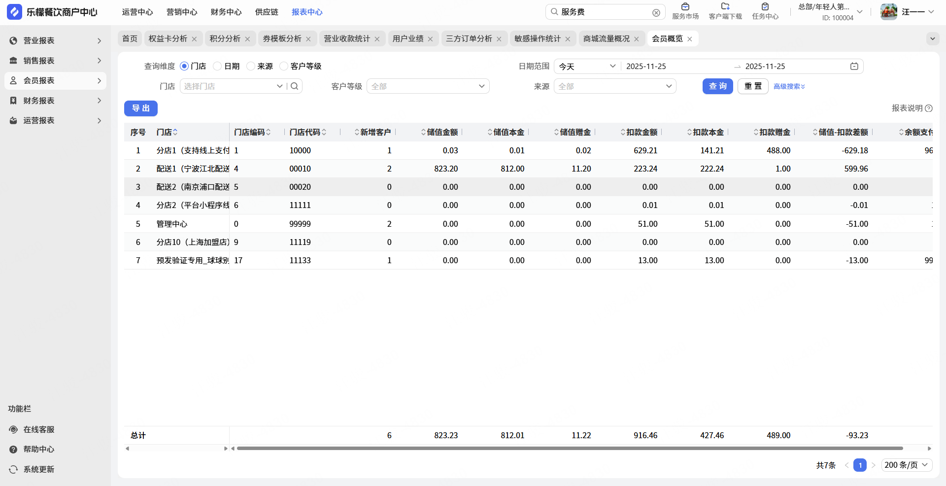 👉【操作路径】:①报表中心模块会员概览-②自主筛选日期门店等条件-③查看相关会员数据