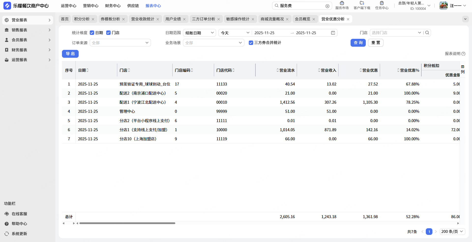 👉【操作路径】:①点击报表中心-营业优惠分析-②自主选择日期门店等条件-③查看相关折扣数据
