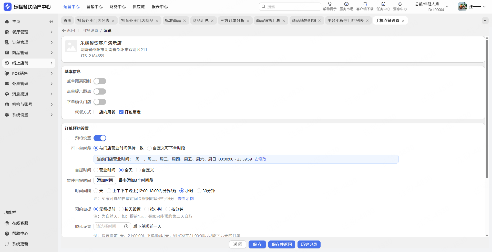 👉【操作路径】:打开【乐檬餐饮商户中心-WEB】(https://mars-portal.shopmars.cn/),依次点击①设置-②门店设置-③配送设置。选择指定的门店,在配送设置中启用自提,并根据店铺实际情况设置就餐方式和自取时间等配置项。