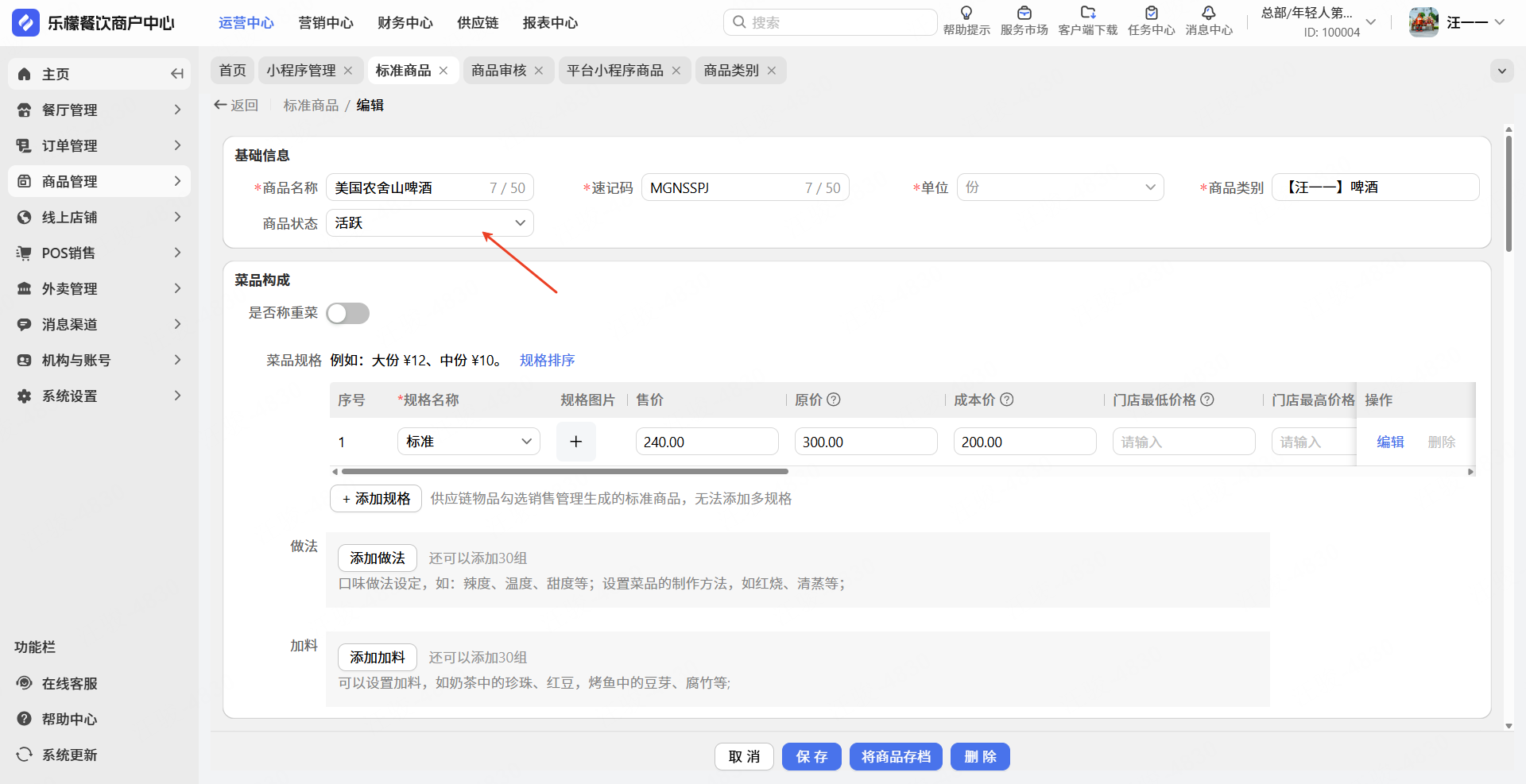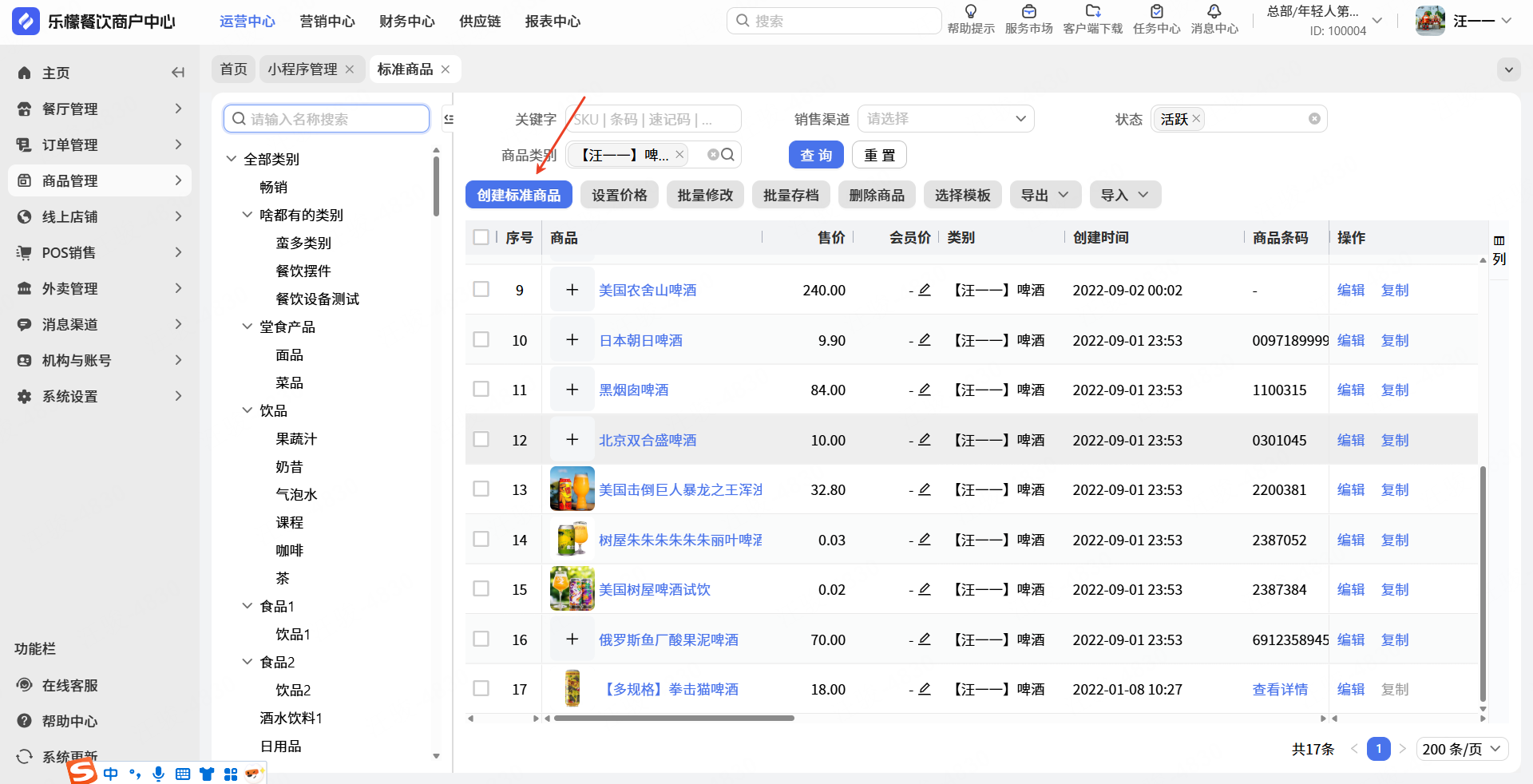 👉【操作路径】:打开【乐檬餐饮商户中心-WEB】,依次点击①商品-②标准商品-③创建商品。