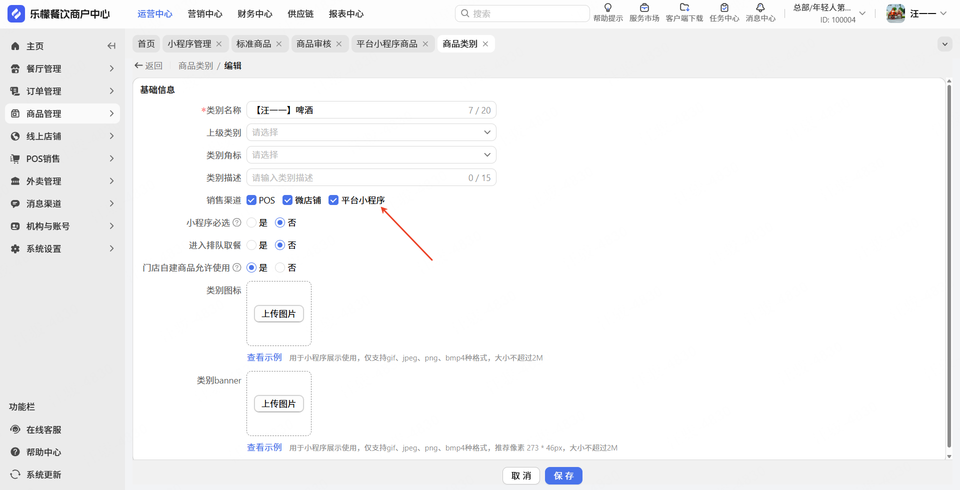 创建商品时需要保证商品状态为【活跃】,销售渠道和应用包含【平台小程序】,商品类别中需要勾选【平台小程序】