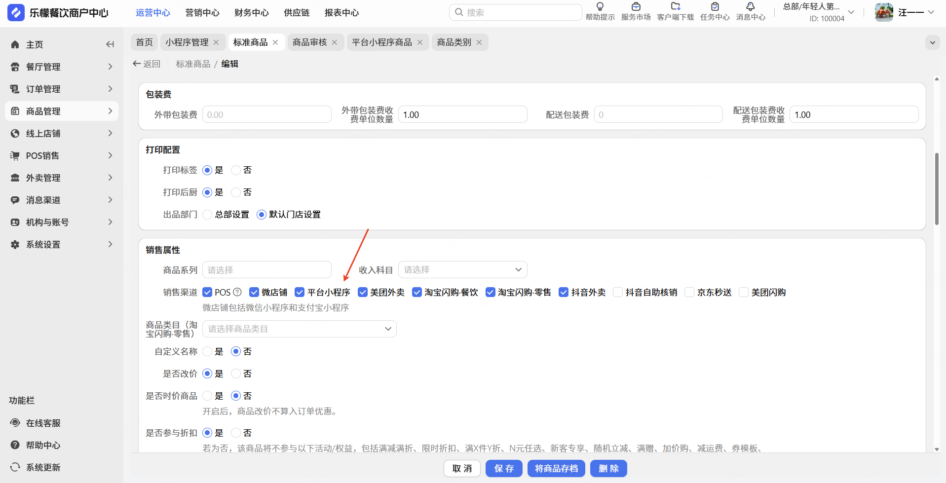 销售渠道和应用勾选了【平台小程序】
