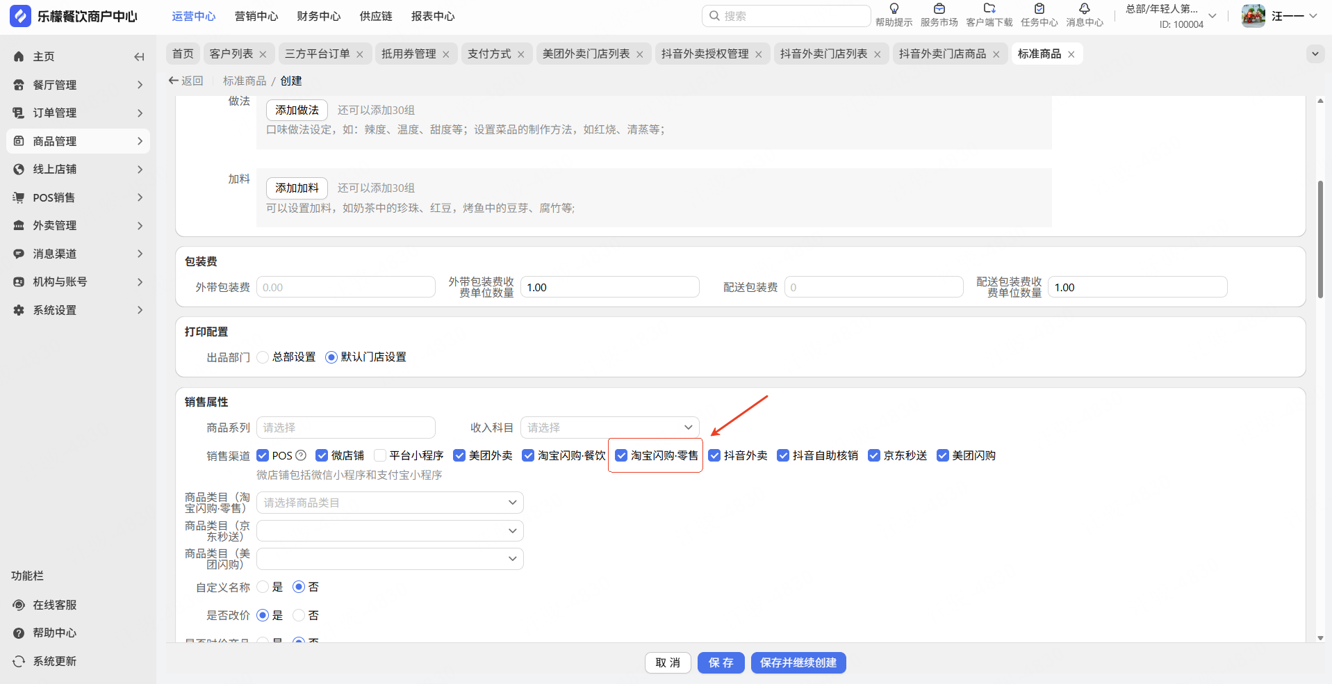解决方案:【商家管理后台】-【商品管理】-【标准商品】-【商品详情】,勾选淘宝闪购.零售渠道