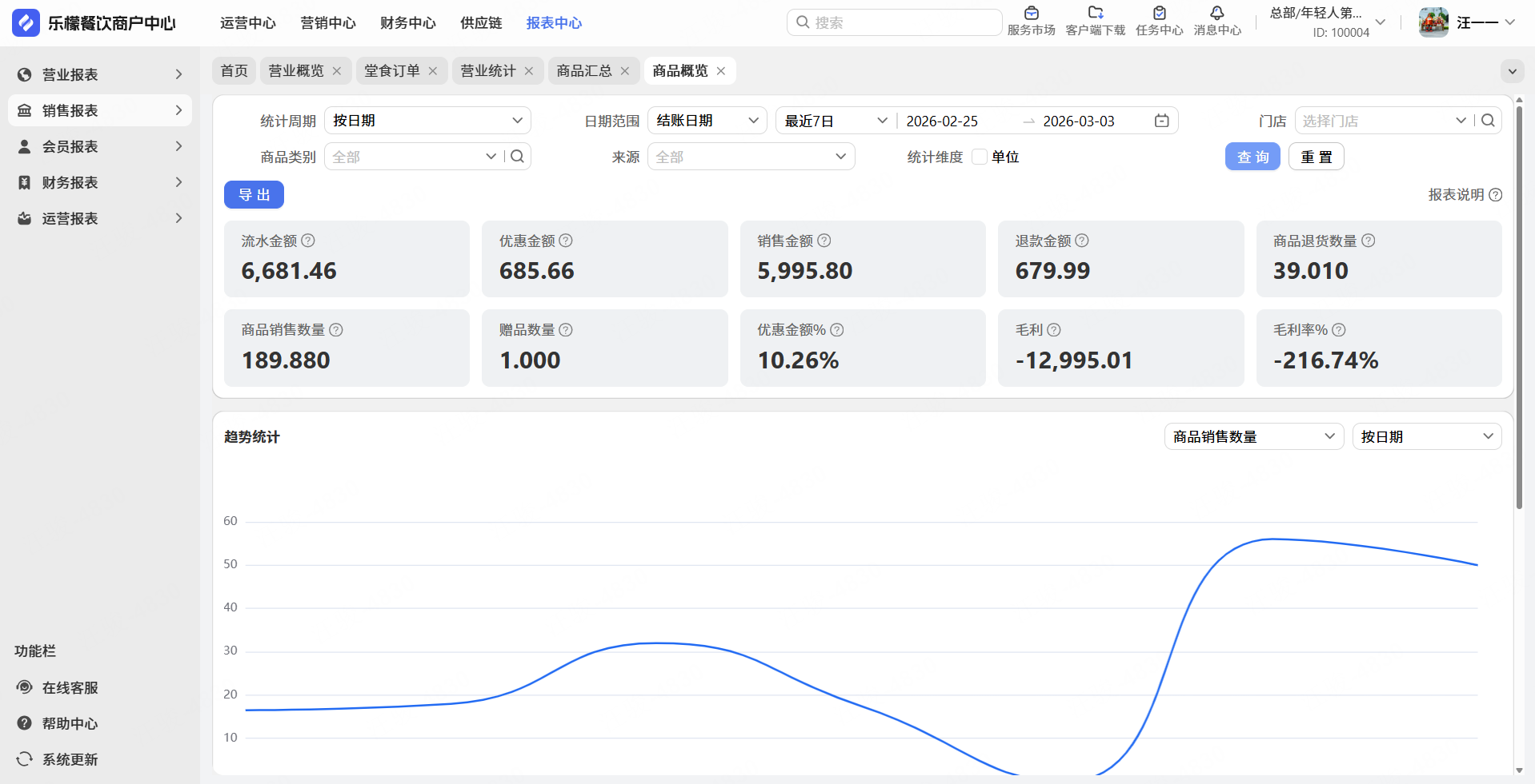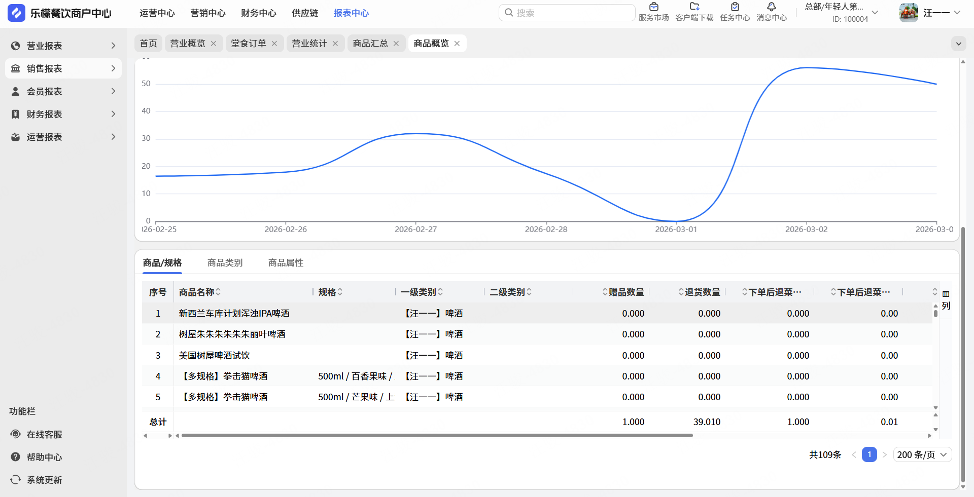 👉【操作路径】:1.PC端-查看方法:打开网页端依次点击:①点击报表中心-销售报表-商品概览-②自主筛选日期门店来源等条件-③查看商品销售数据
