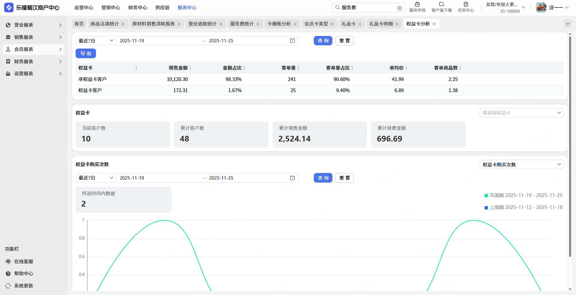 👉【操作路径】:1.PC端-查看方法:打开网页端依次点击:①报表中心-会员报表-权益卡分析-②自主筛选日期、权益卡种类等条件-③查看相关权益卡的销售数据