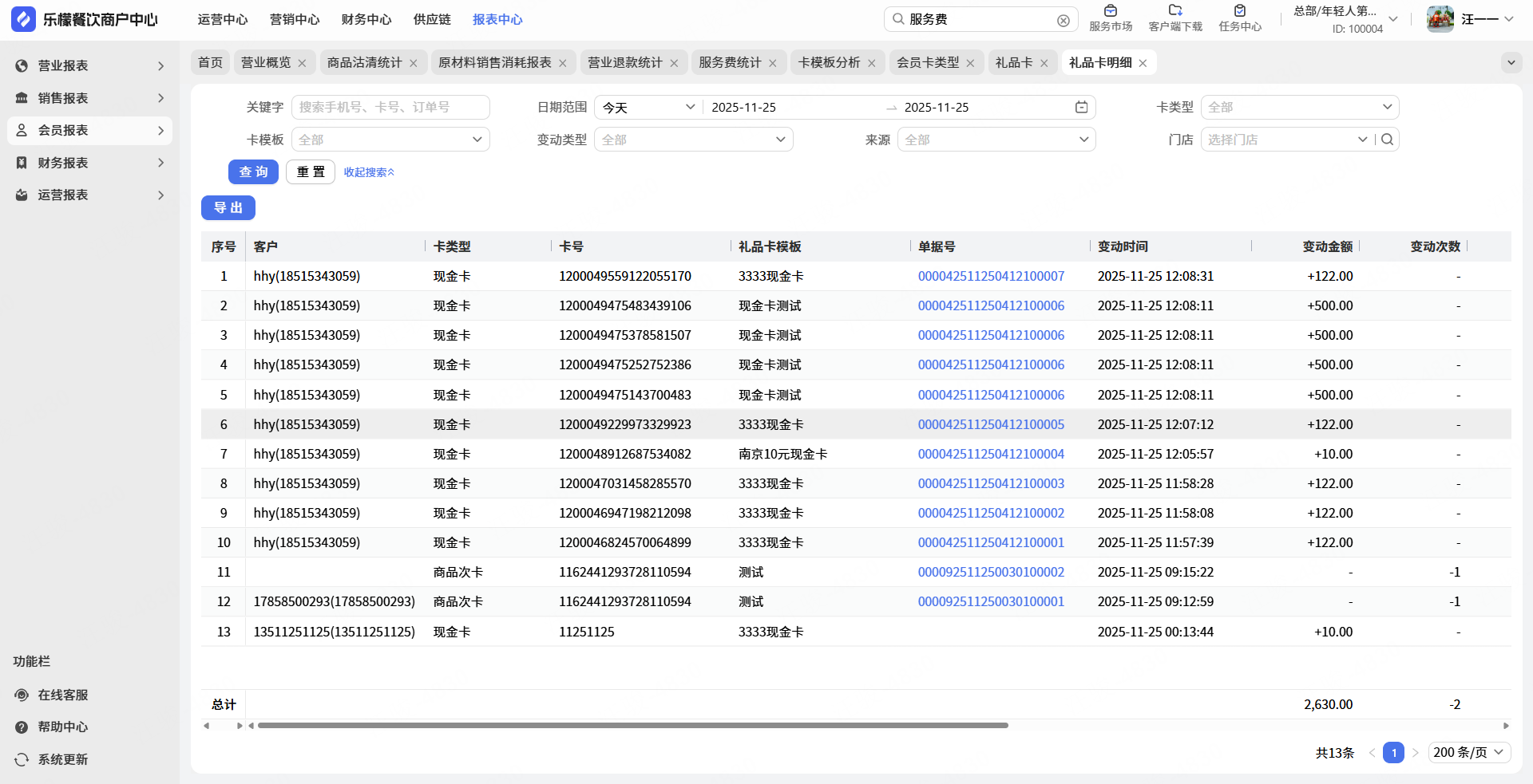 如您想要了解店内会员客户相应卡类型、卡号、礼品卡模板、订单号、变动时间、来源、变动门店