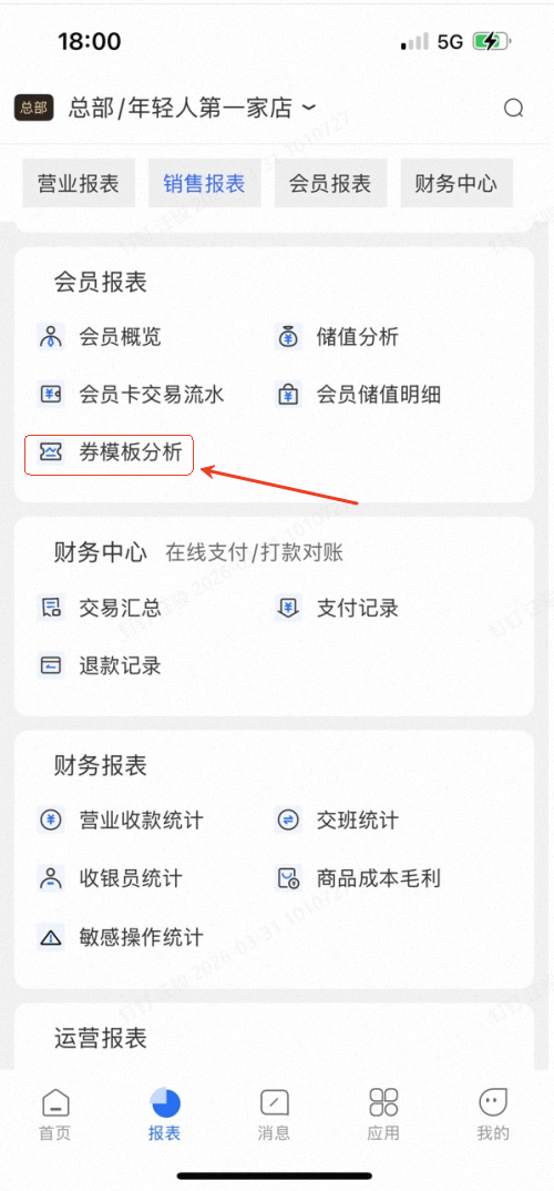 👉【操作路径】:1.PC端-查看方法:打开网页端依次点击:①点击报表中心-会员报表-券模板分析-②点击券模板分析