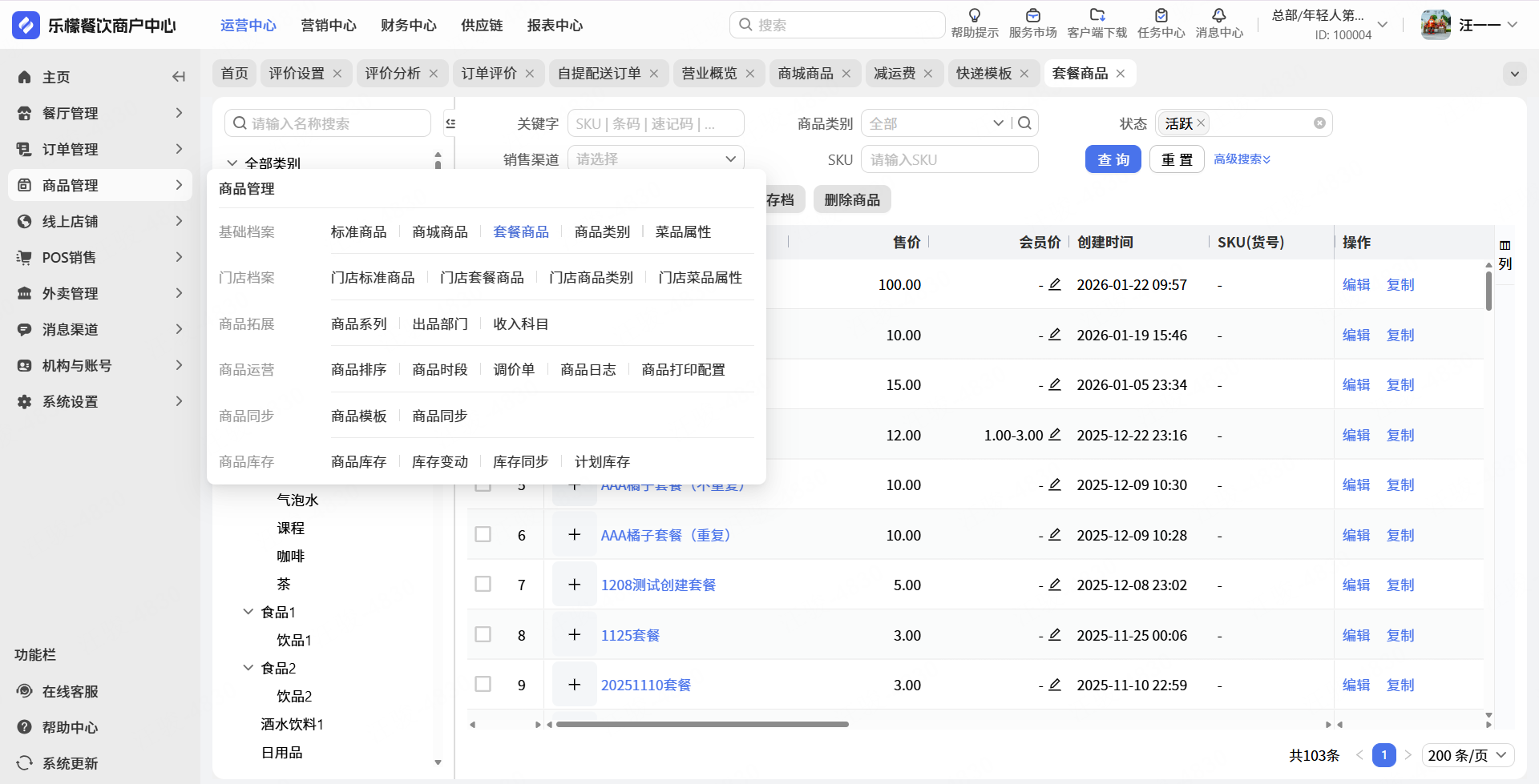 商家希望实现商品捆绑售卖提高客单价,可通过设置套餐的方式实现,比如:双人套餐包含两个固定的热菜和一个凉菜,凉菜可以进行二选一,可直接在乐智后台中进行套餐的添加。