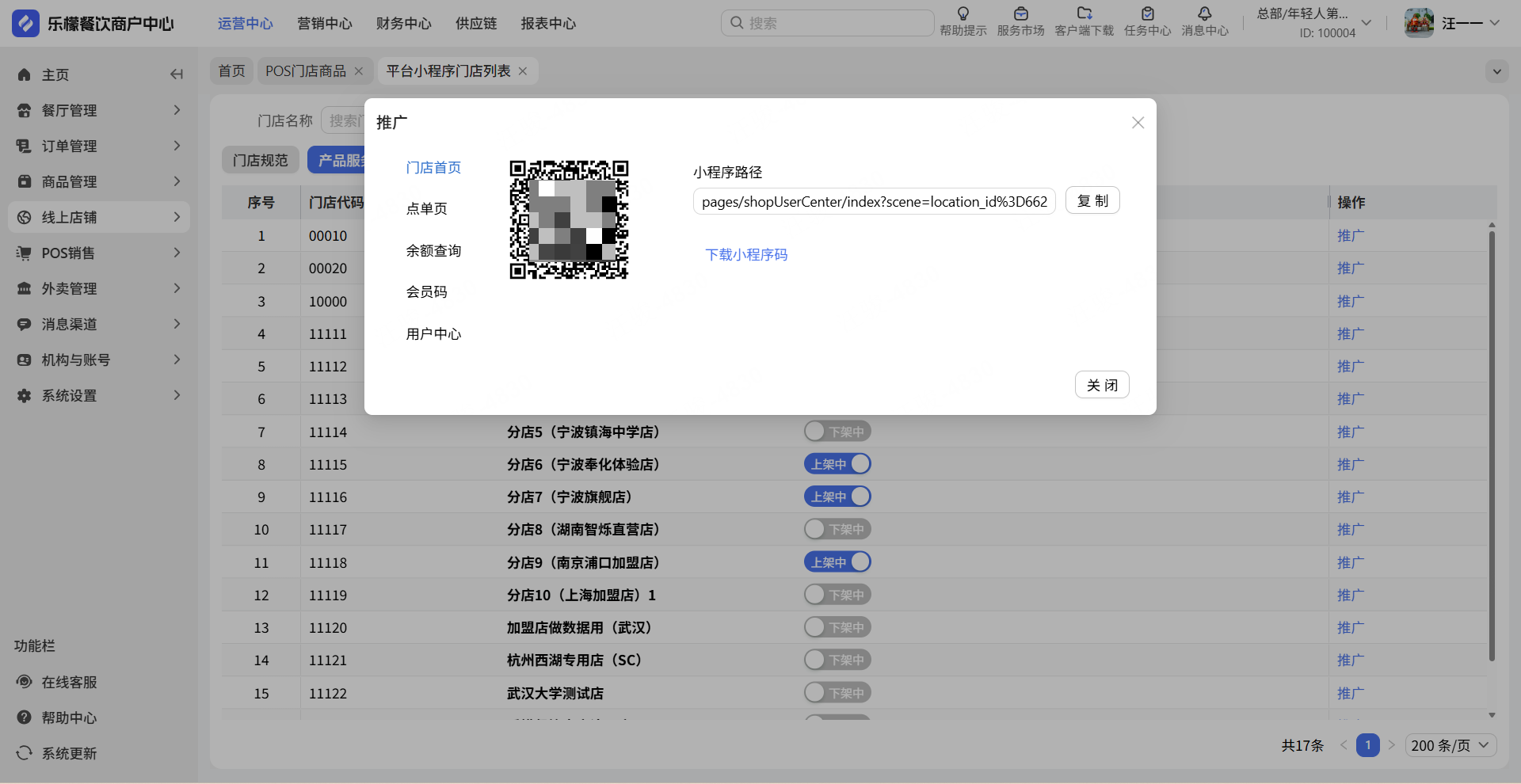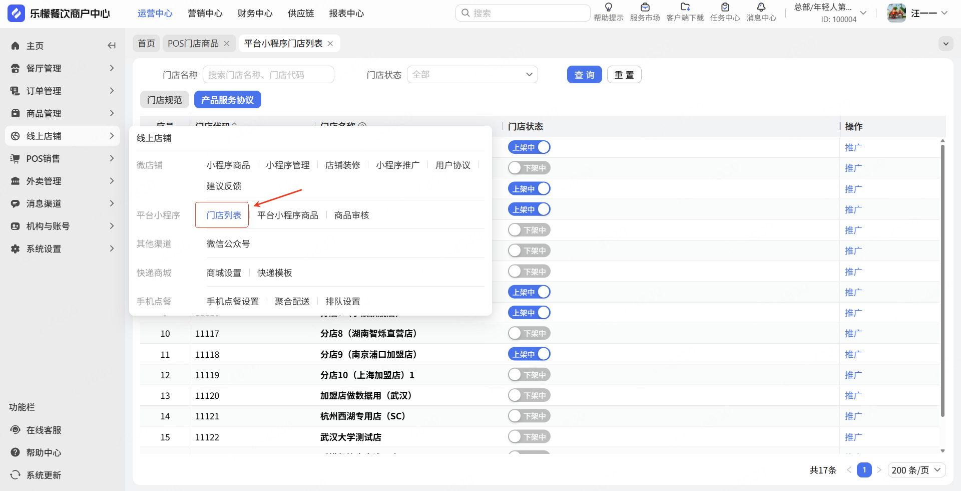 👉【操作路径】: 点击”平台小程序”,点击”门店列表”开启”门店状态”点击”推广”