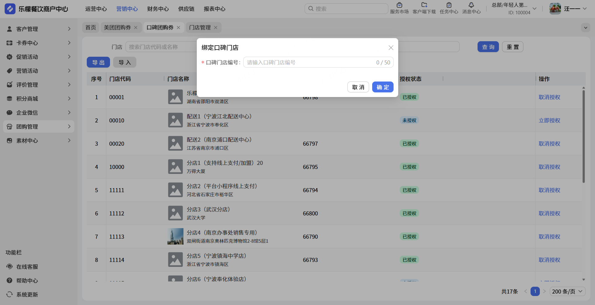👉【操作步骤】:①输入后台网页地址②营销中心③团购管理④口碑券⑤点击立即授权