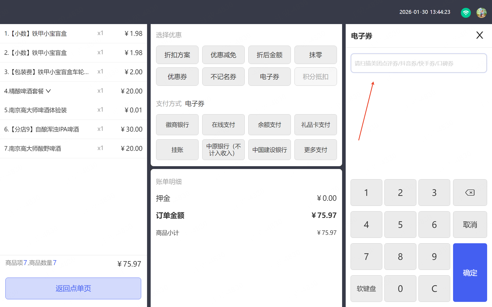 👉【操作步骤】:微信小程序堂食点单(先付费模式)输入三方平台券码验券。