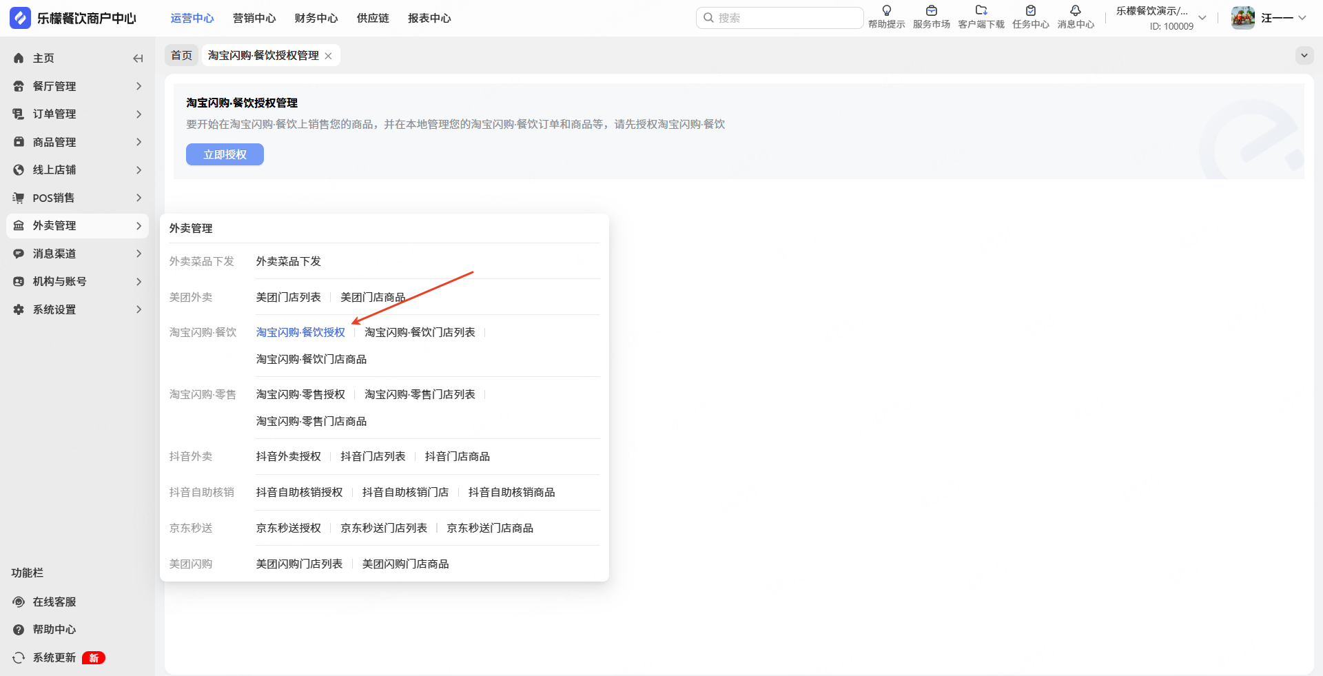 👉【操作路径】:打开WEB端,依次点击:点击淘宝闪购.零售-①授权管理-②立即授权-③在跳转页输入淘宝闪购.零售的账号密码-④点击登录按钮