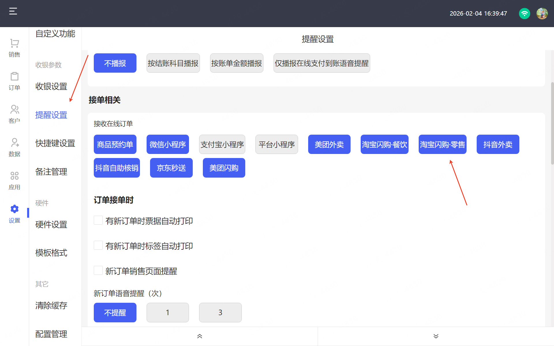 👉【输入步骤】:前台开启接受淘宝闪购.零售订单并自动打印票据