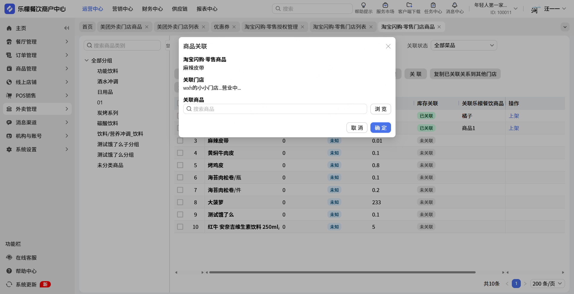 👉【输入步骤】:进入关联界面-搜索乐檬餐饮商户中心里面对应的商品点击确定完成关联