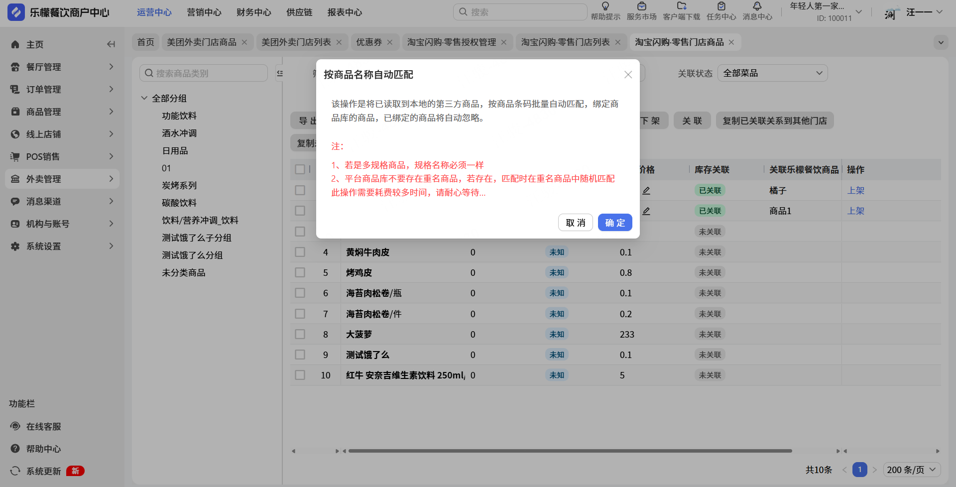 注意:该操作是将已读取到本地的第三方商品,按商品名称批量自动匹配,绑定商品库的商品,已绑定的商品将自动忽略。