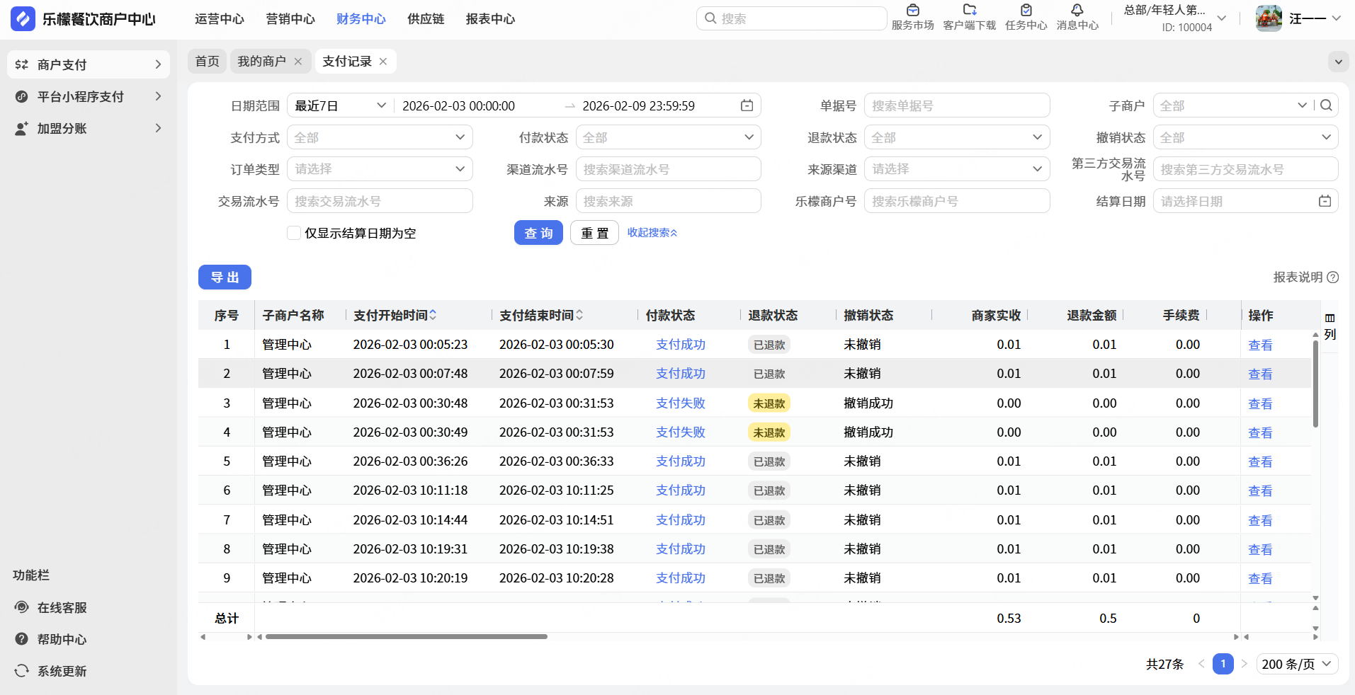 👉【操作路径】:打开WEB端【乐檬餐饮商户中心】依次点击:点击商户支付-支付记录