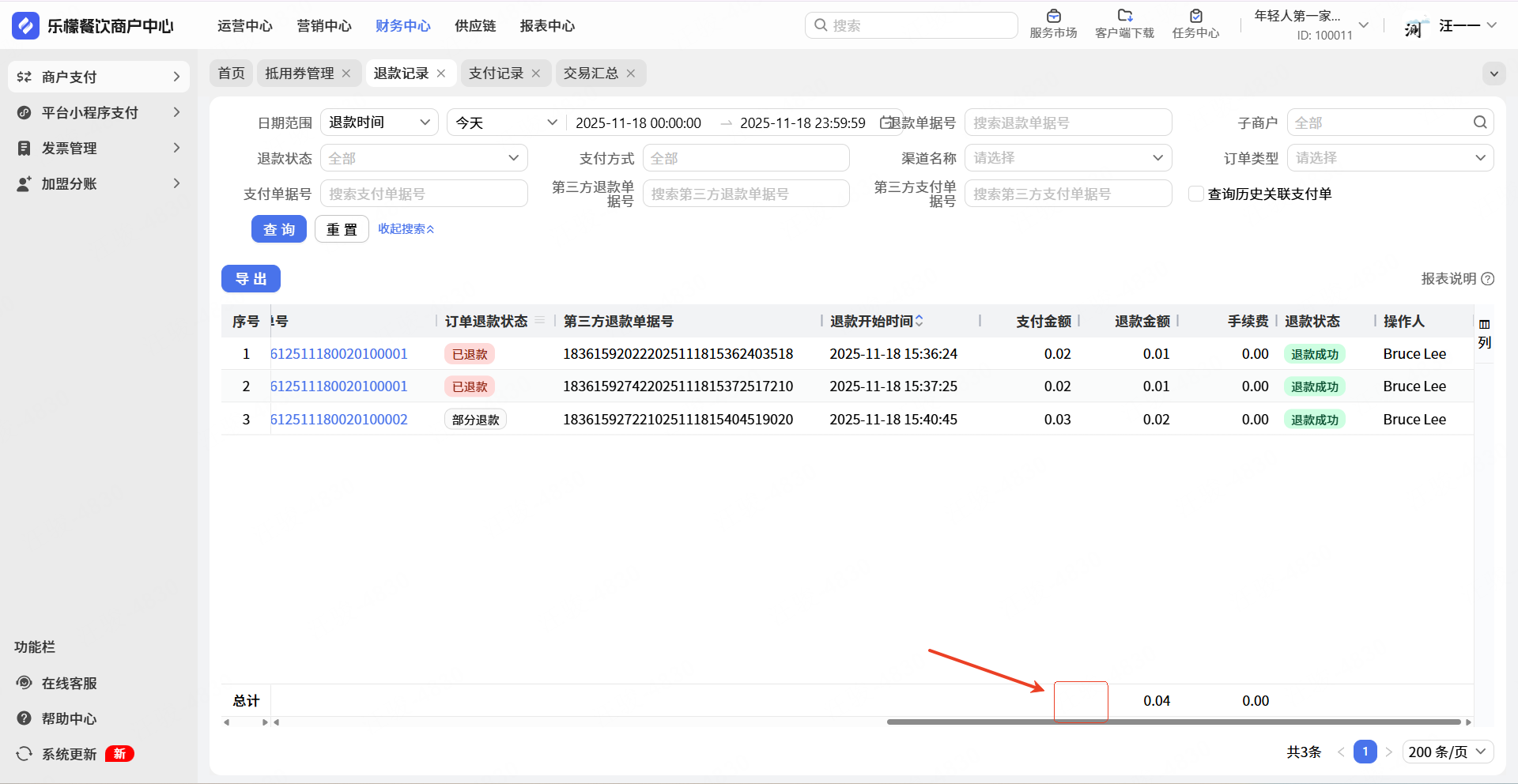 目前退款记录中,每次退款(包括部分退)都会生成1条记录。支付金额合计没有意义。