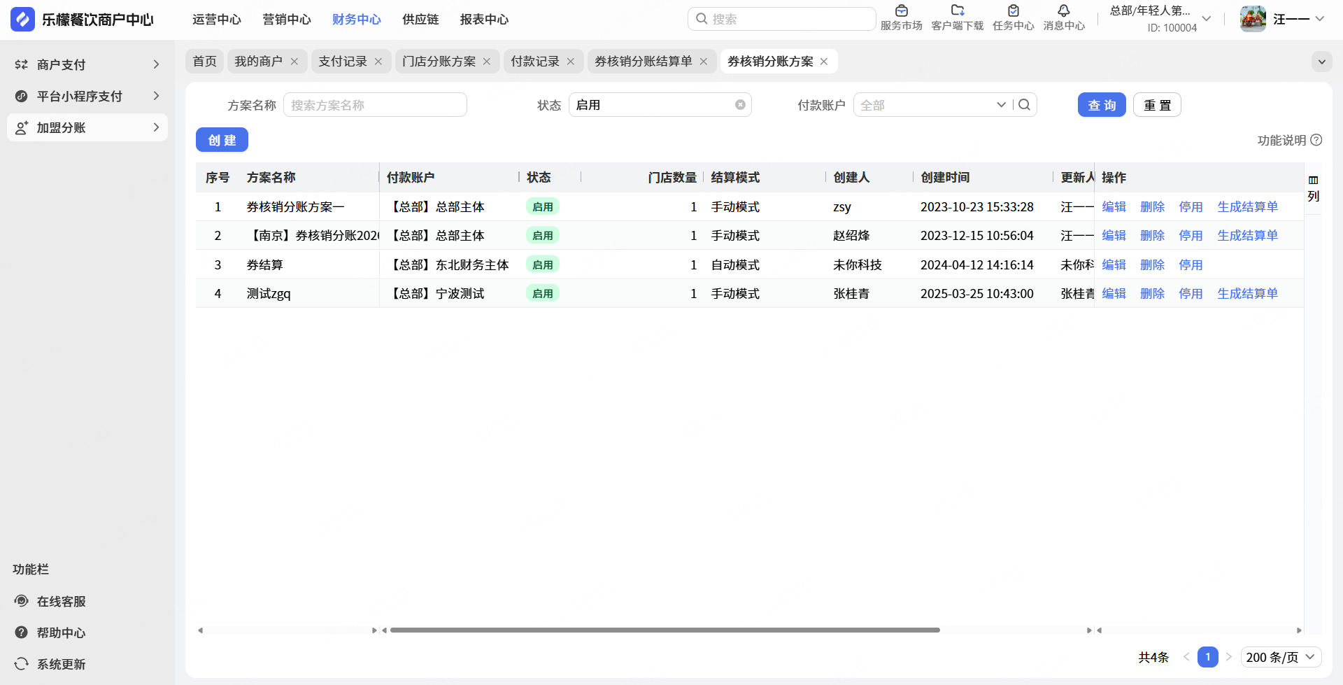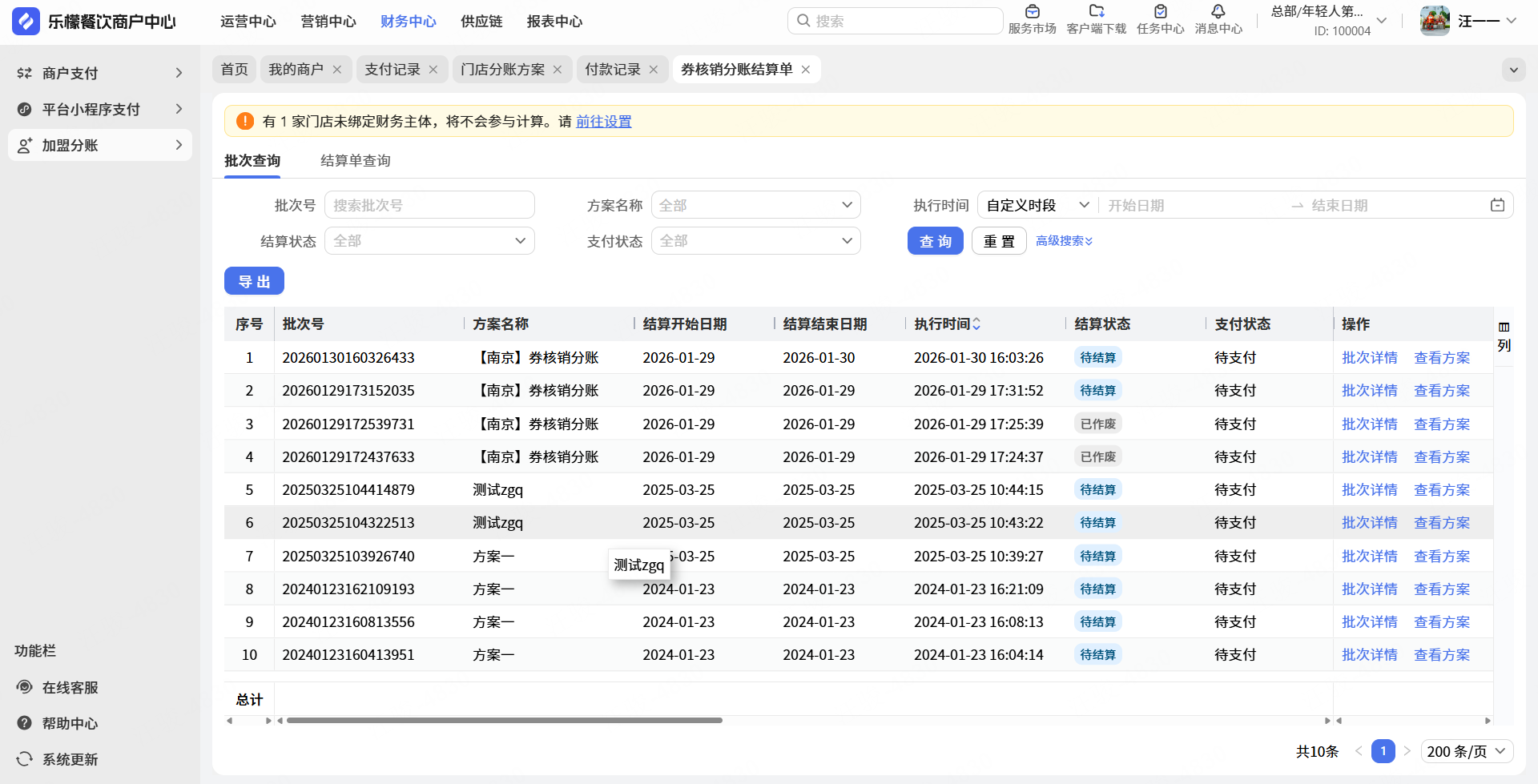 2.生成分账结算单后,可以在券核销分账结算单里面查询结算单,首先每生成一次结算单就算一个批次,这里可以按照批次查询每一次的结算结果,可以查询到批次号对应的结算日期,结算余额等字段,并且可以查看批次详情(设置方案时我们需要在通用设置里对每个门店的财务主体进行绑定)