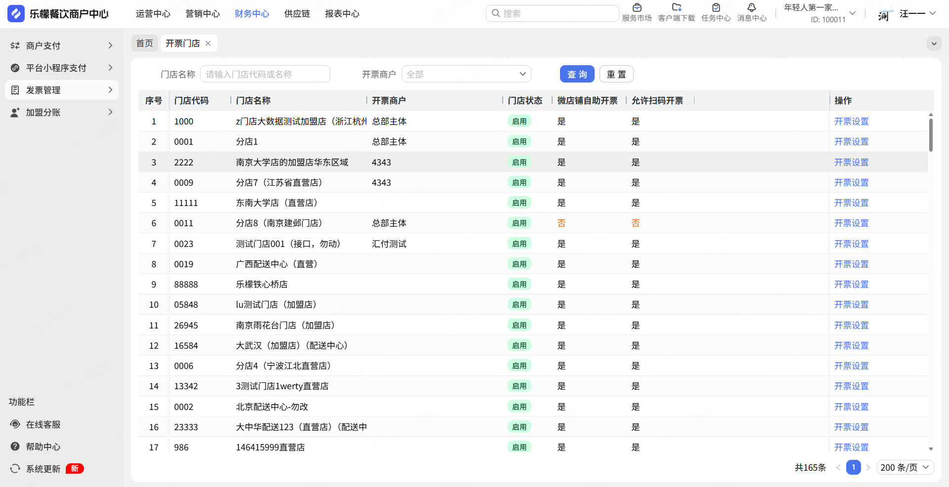 在门店设置中,可针对门店设置“是否允许开票”,“开票主体”,“收款人”,“复核人”,“开票人”等信息,可针对门店设置“是否允许扫码开票”,“税率设置”等信息