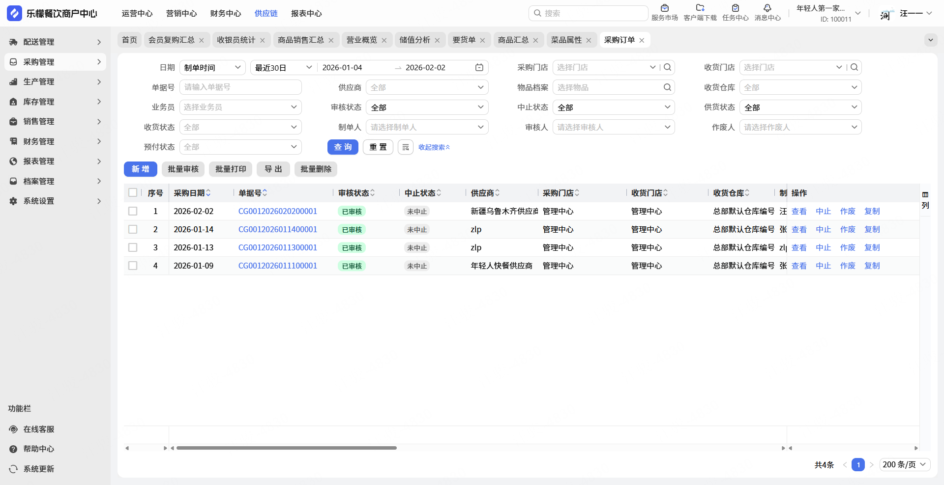 👉【开启路径】:打开【乐檬餐饮商户中心-WEB】,依次点击①进销存-②采购-③采购订单-④新增。
