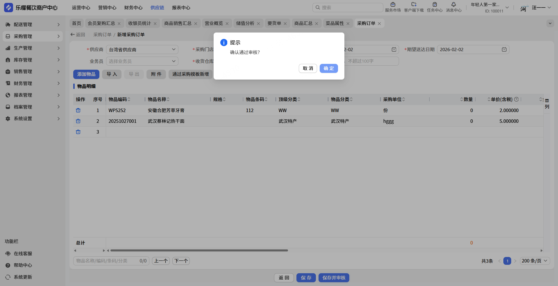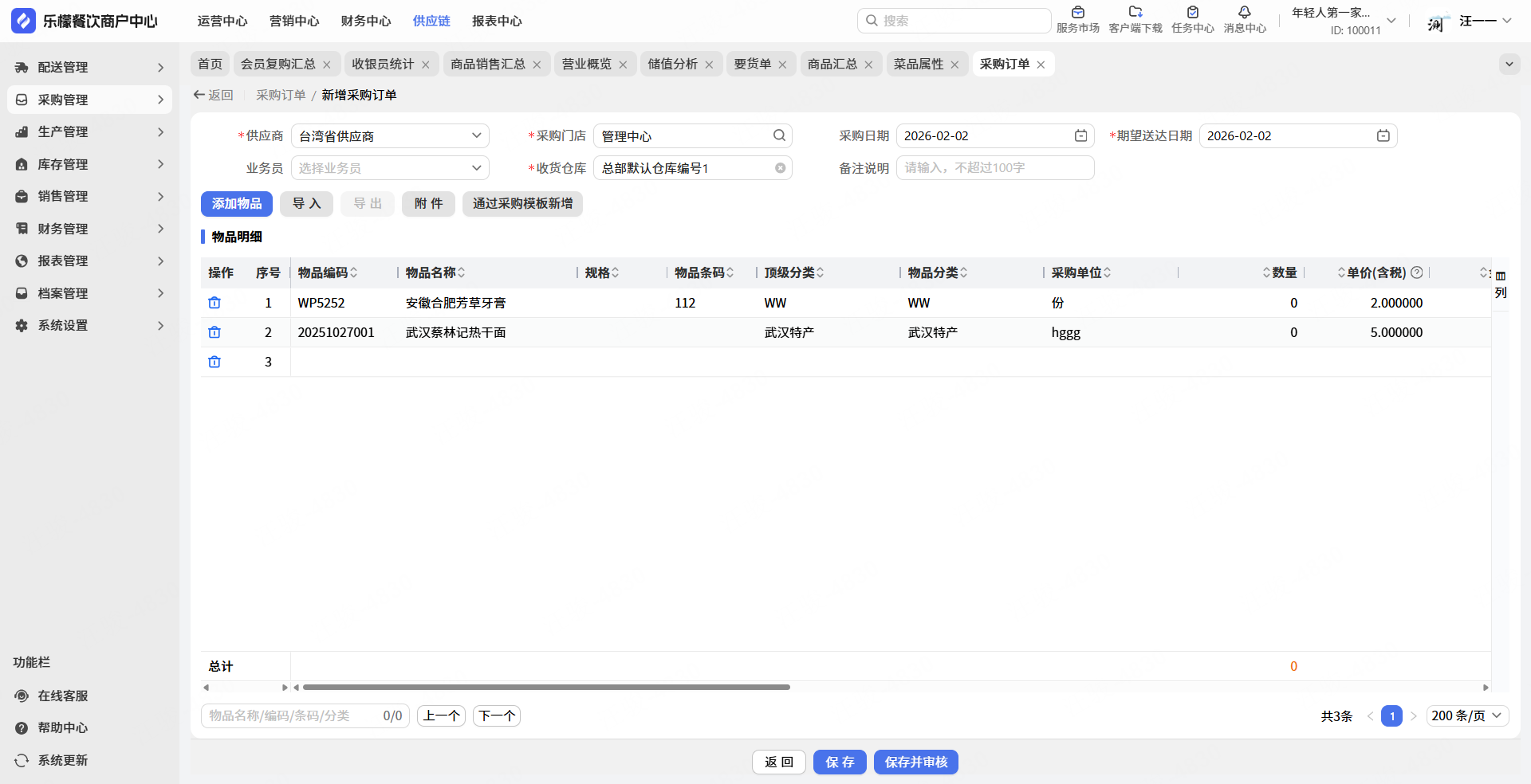 ⑤选择需要采购的商品及采购数量,填好后保存或者保存并审核。