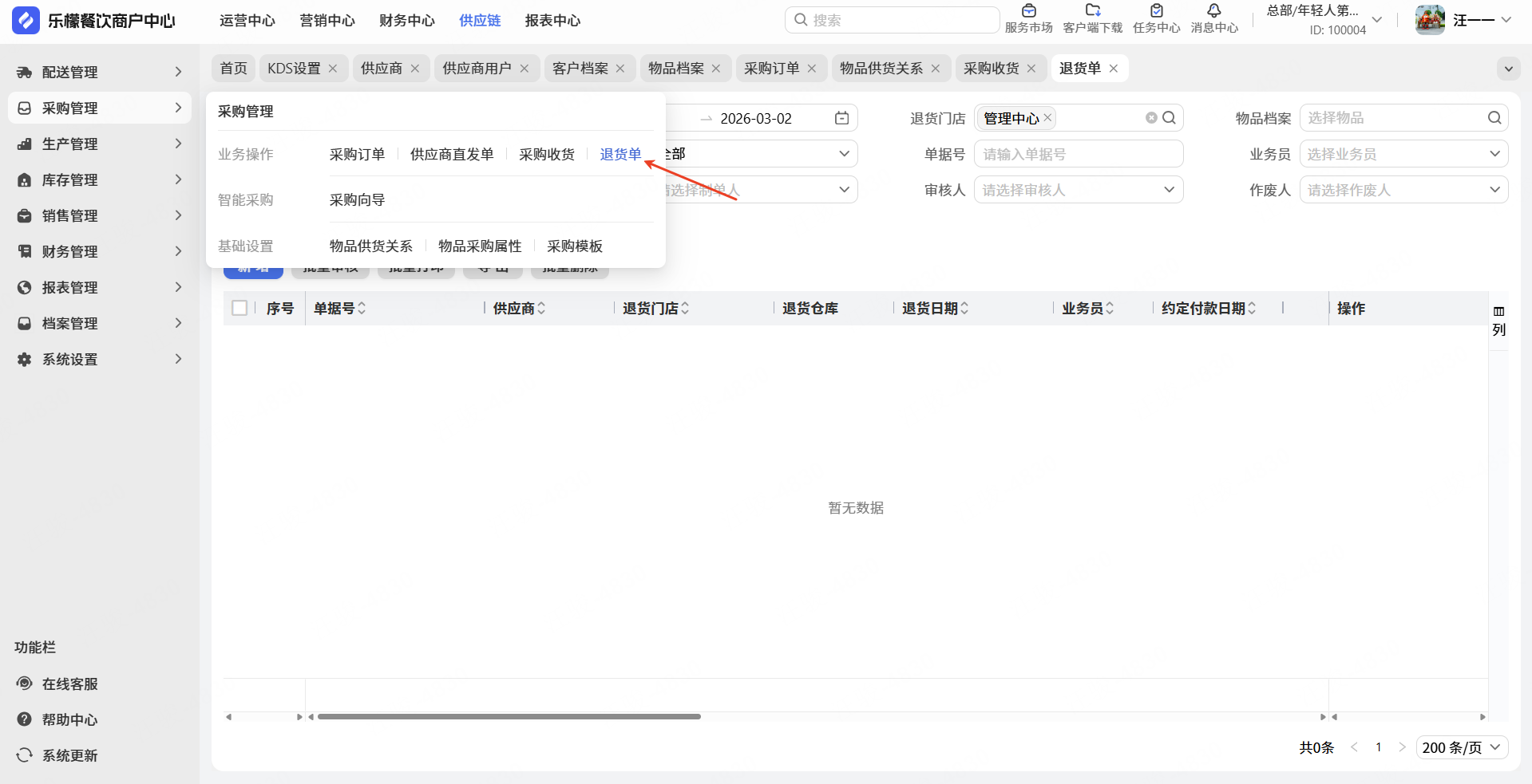 👉【开启路径】:打开【乐檬餐饮WEB】,依次点击①供应链-②采购管理-③退货单-④新增。