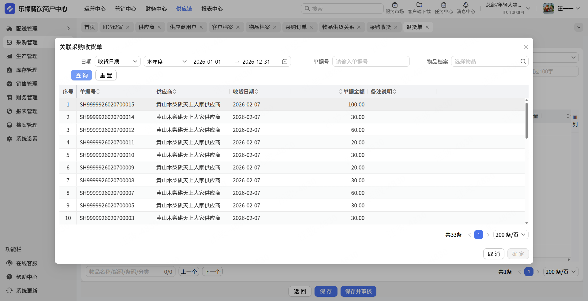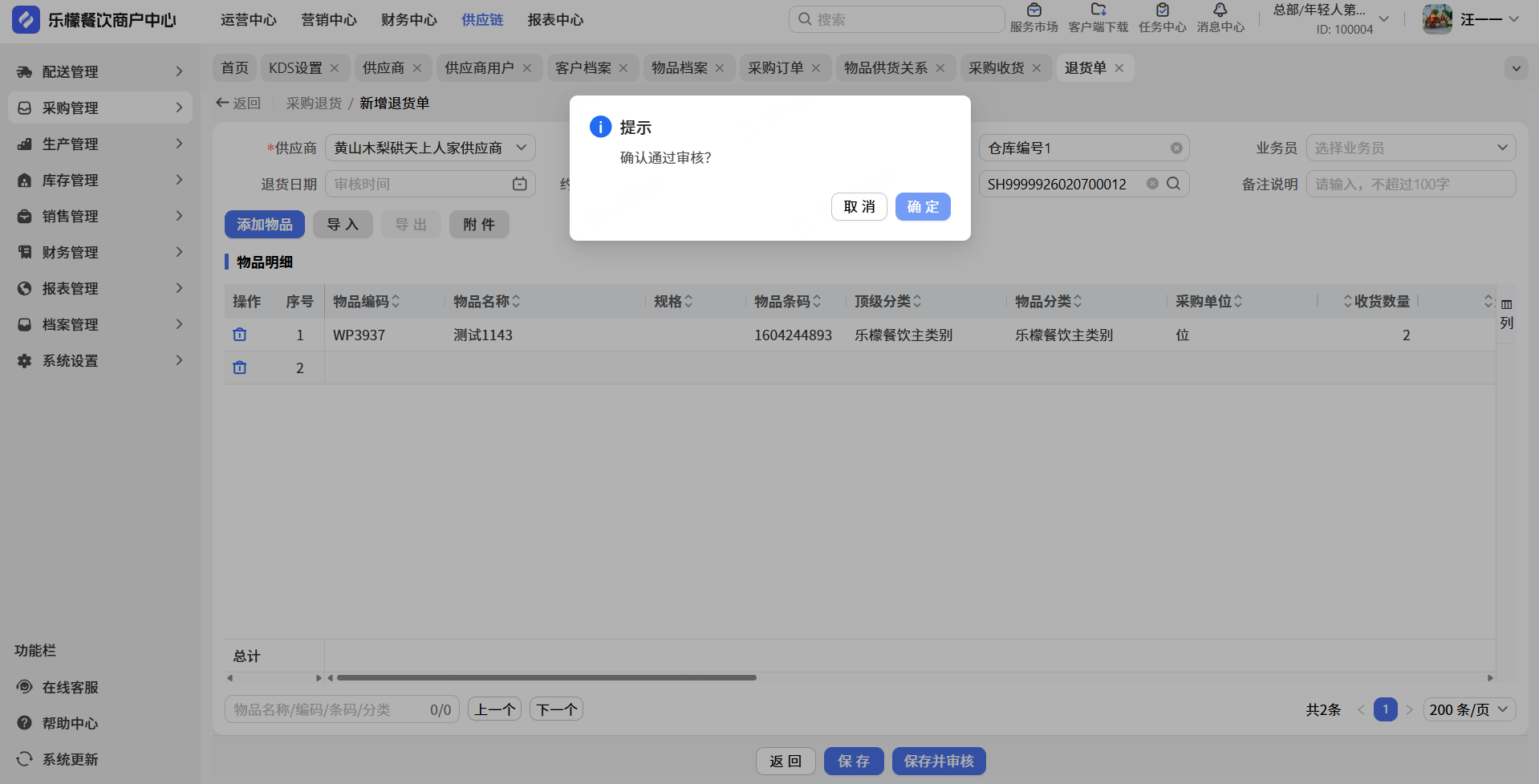 与供应商退货,需要通过生成退货单完成,根据退货单数据,系统将自动扣减库存。