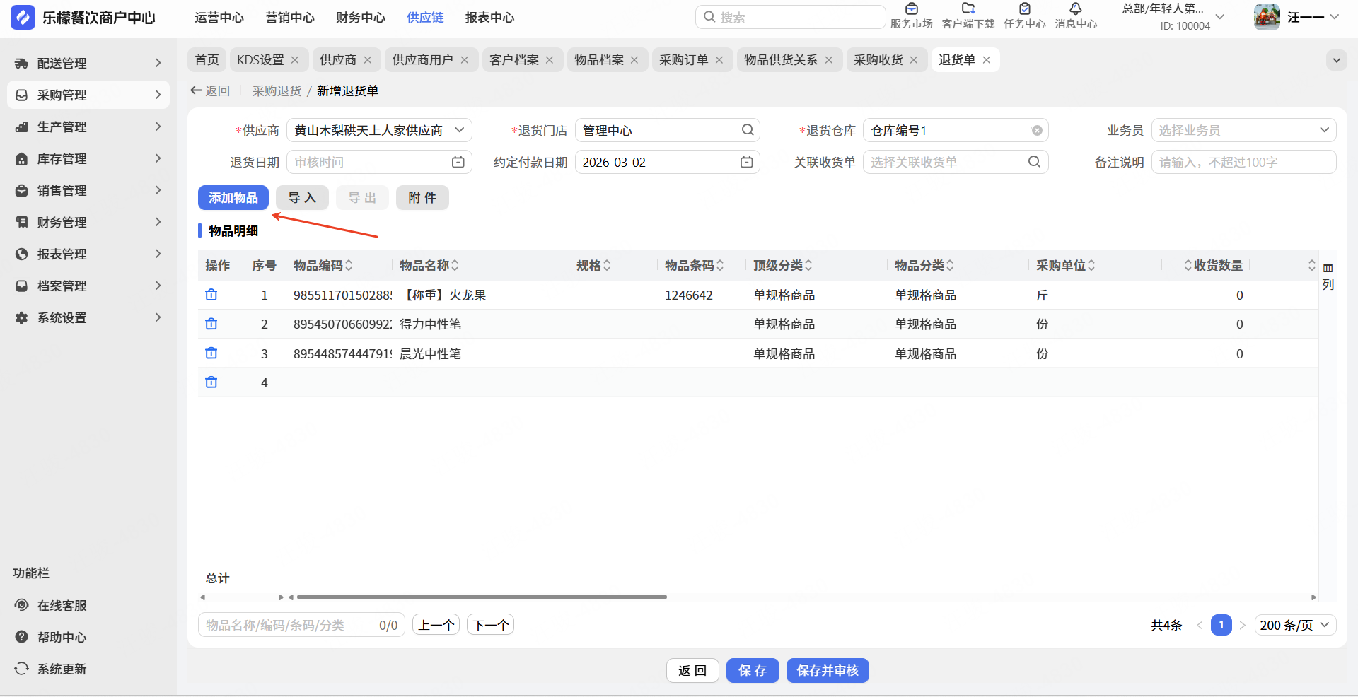 👉【开启路径】:打开网页后台,依次点击①供应链-②采购管理-③退货单-④新增⑤直接输入单据信息-⑥保存⑦保存后审核。