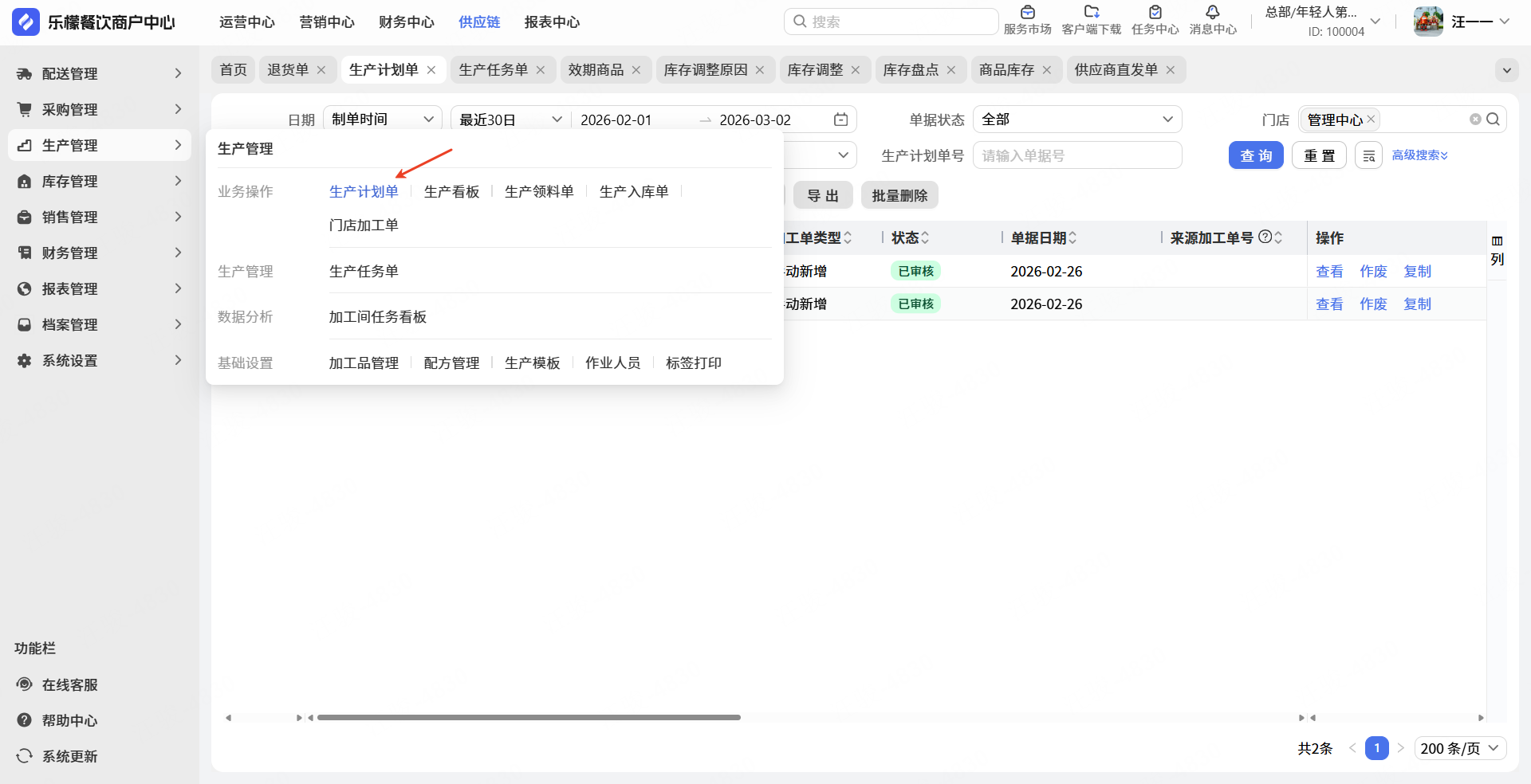 👉【开启路径】:打开【乐檬餐饮商户中心-WEB】,依次点击①供应链-②生产管理-③生产计划单-④新增。