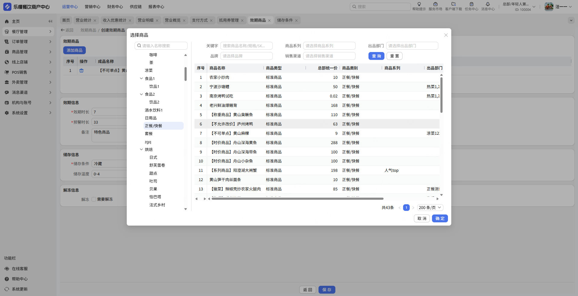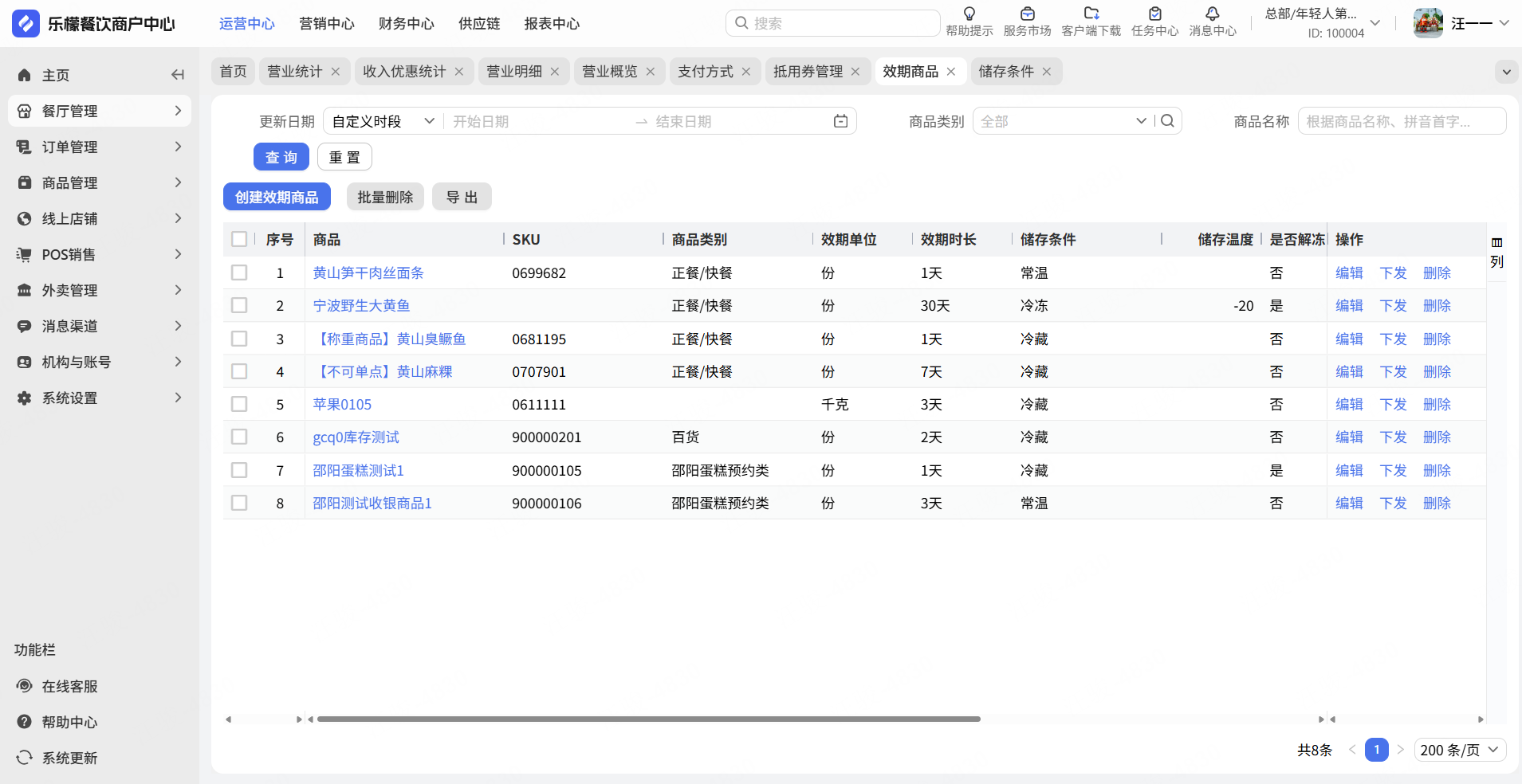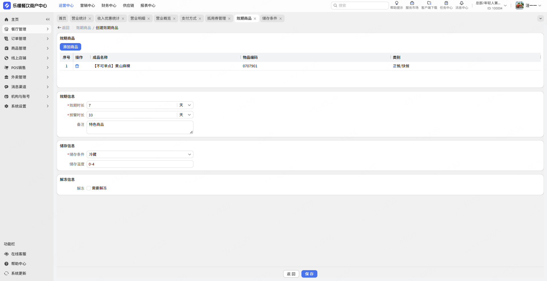 👉【开启路径】:打开【乐檬餐饮商户中心】,依次点击①运营中心-餐厅管理-②效期管理-③效期商品-④创建效期商品。