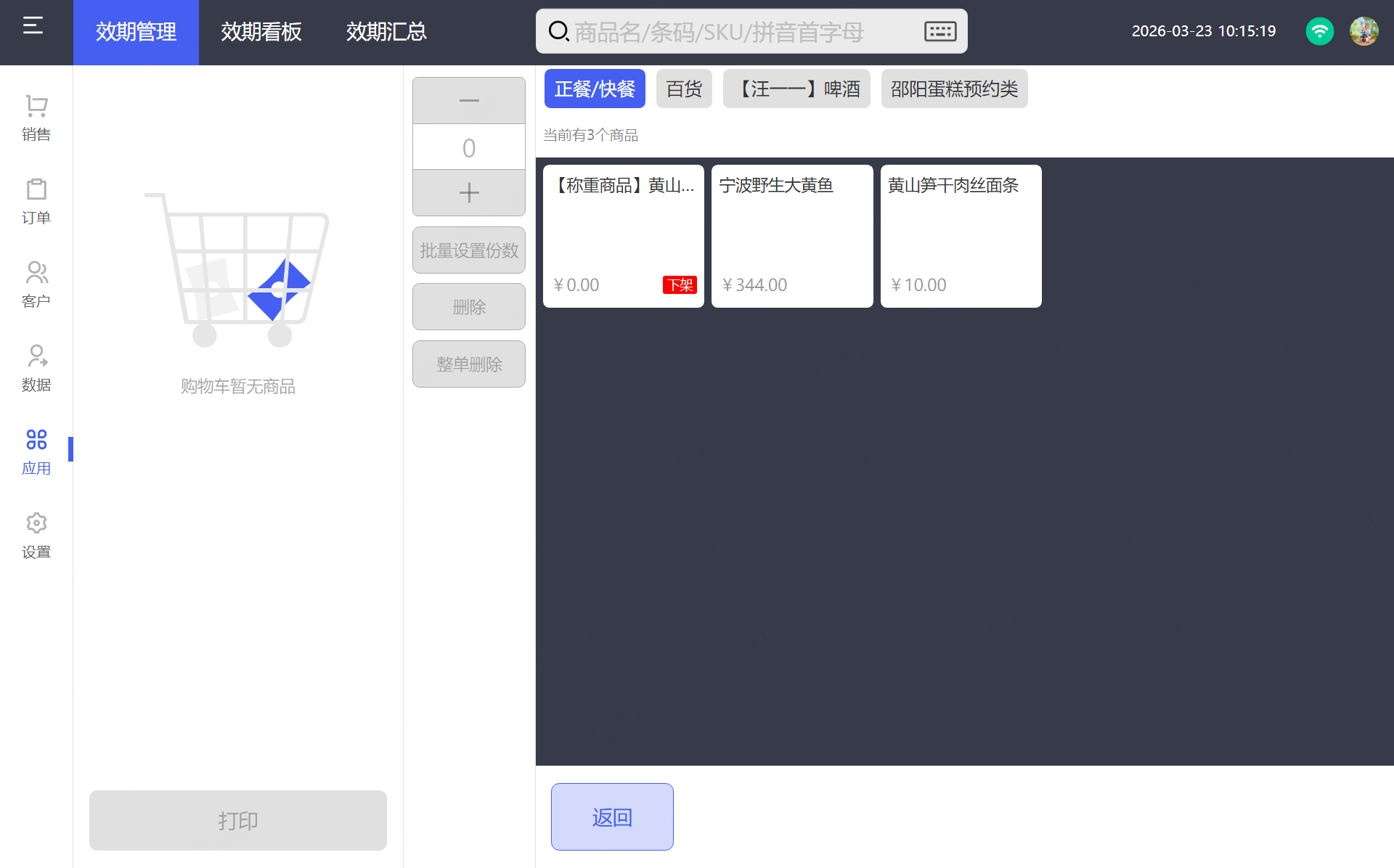 👉【开启路径】:打开【乐檬餐饮POS】,依次点击①应用-②效期管理-③效期看板。