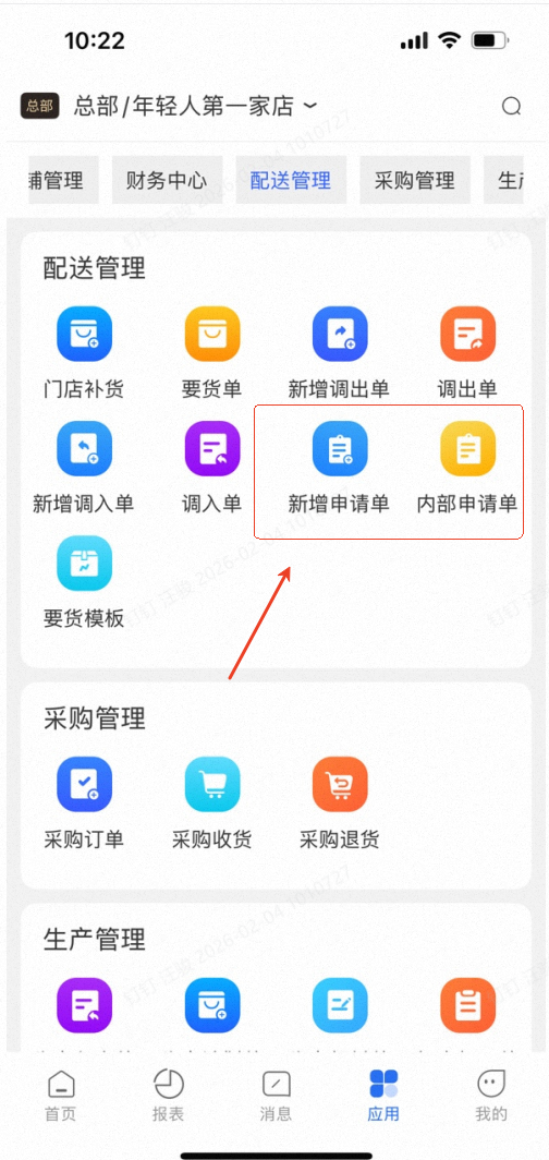 👉【开启路径】:打开【乐檬餐饮管家APP】,①点击新增申请单-②选择申请门店-③选择申请调货商品-④确认审核。