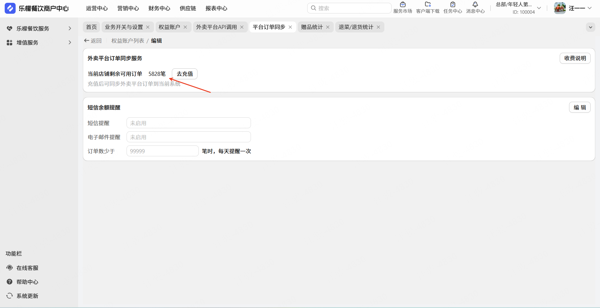 解决方案:【商家管理后台】-【设置】-【增值服务】-【权益账户】-【外卖平台订单】,进行订单数充值,此外可设置订单数不足的提醒设置