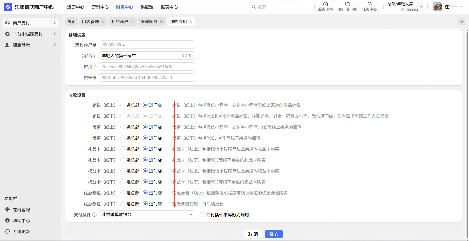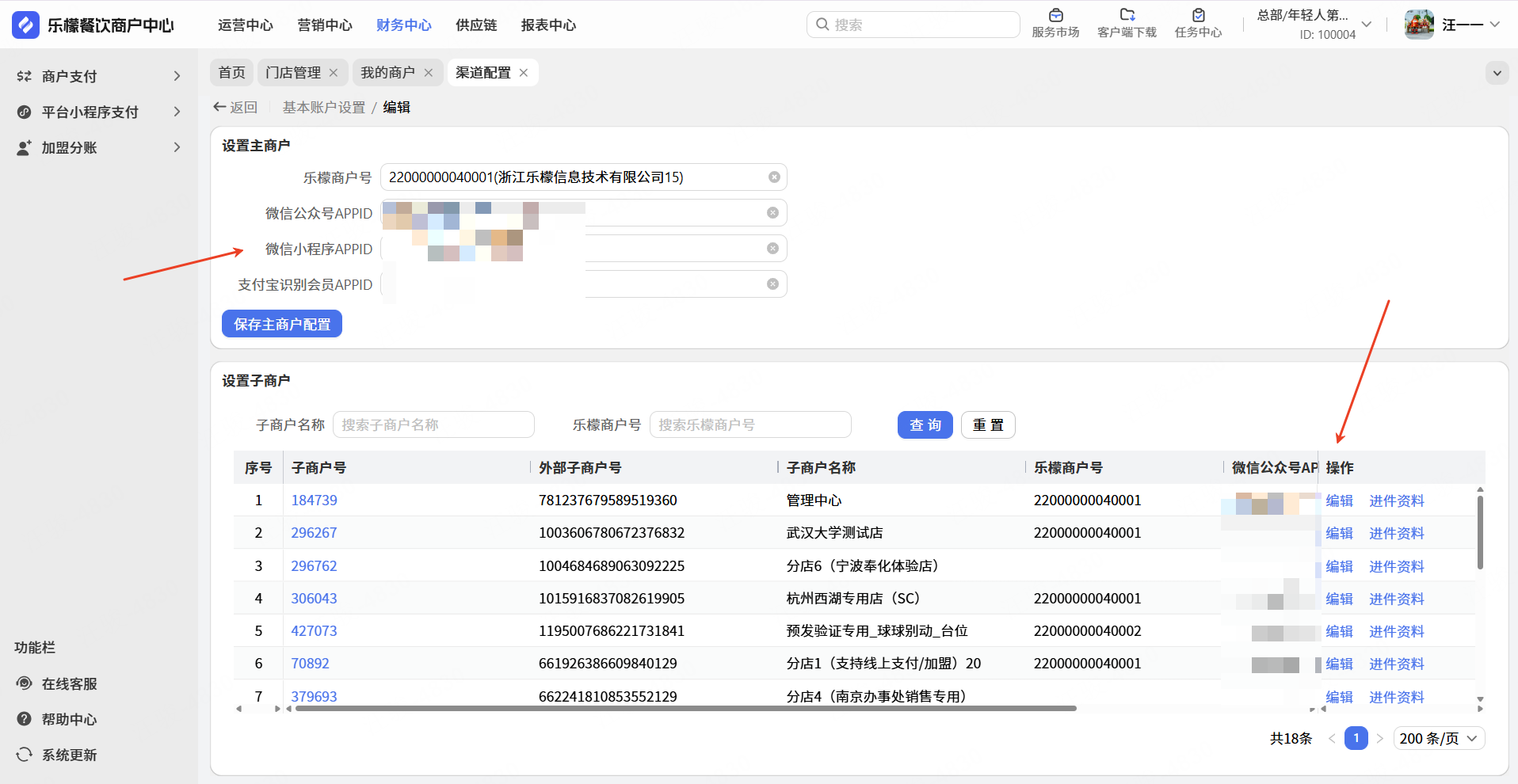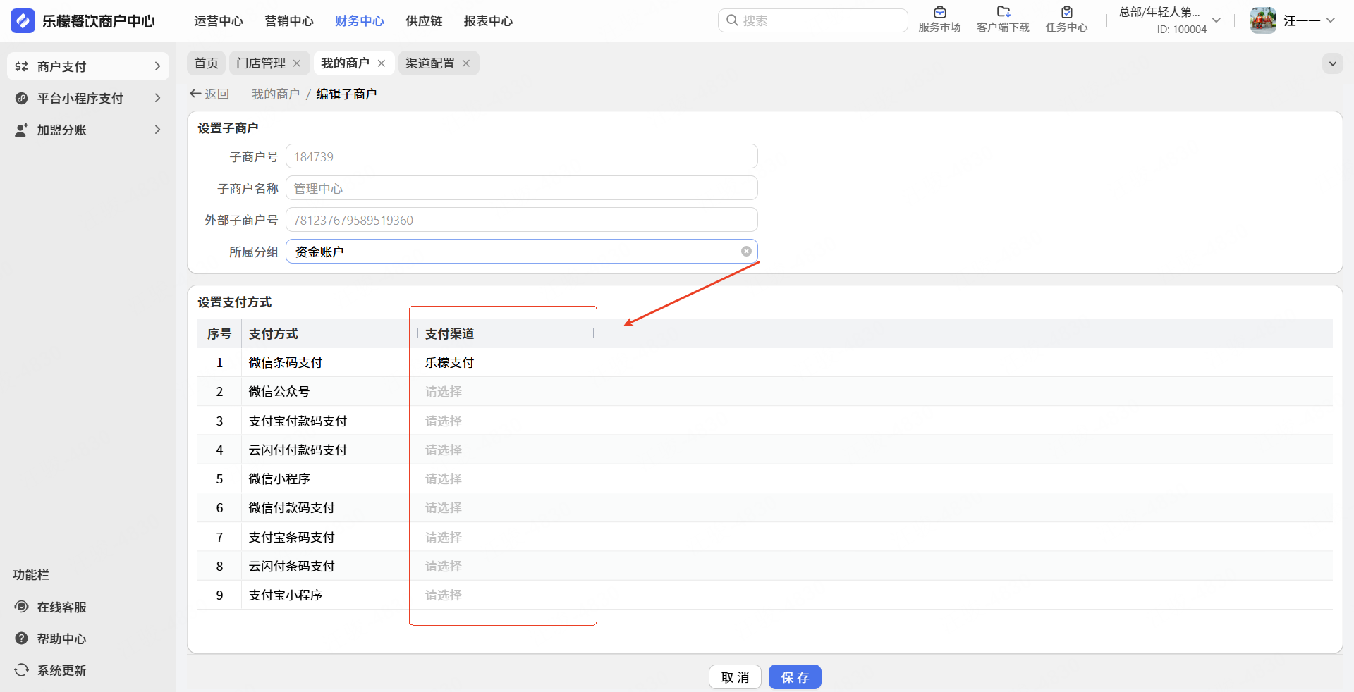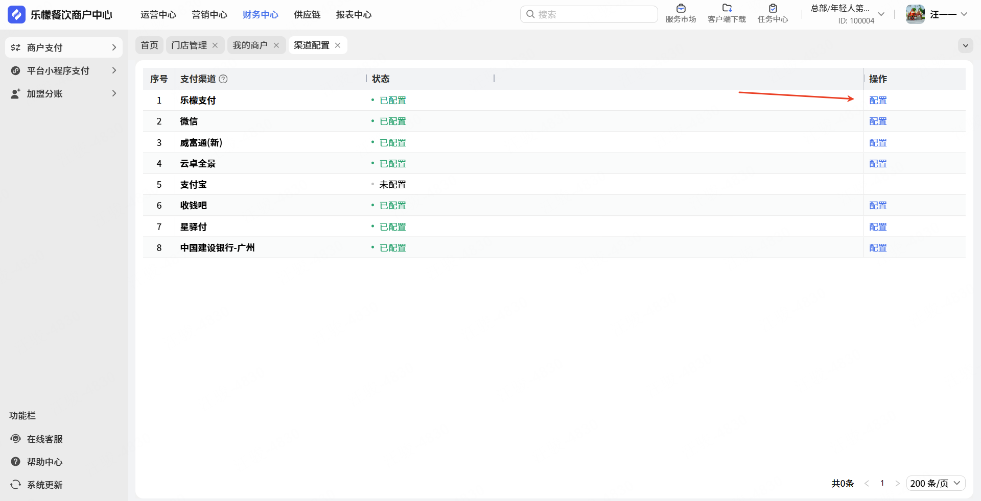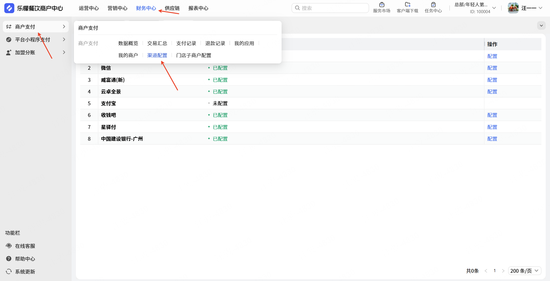 👉【操作路径】:1.登录后台进入乐檬餐饮商户中心 - 2.点击财务中心,选择商户支付 - 3.点击渠道配置 - 4.点击配置