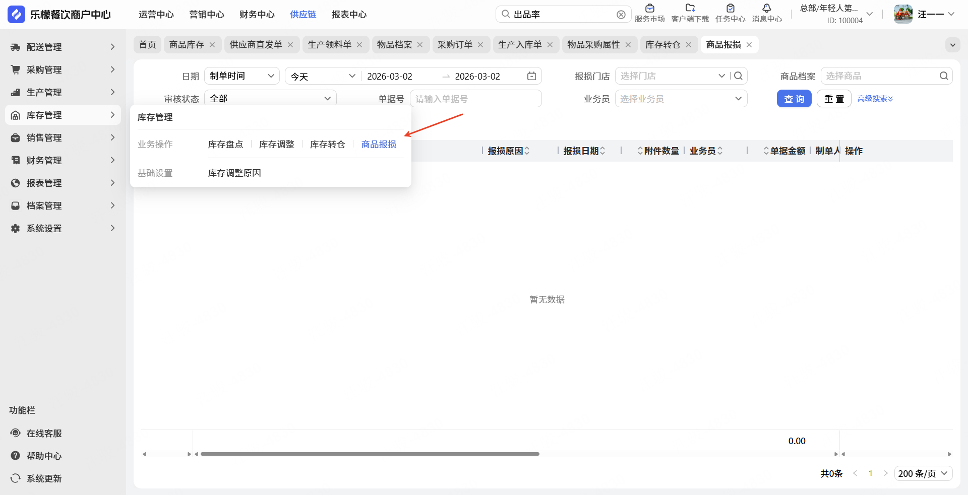 👉【开启路径】:打开【乐檬餐饮商户中心WEB】,依次点击①供应链-②库存管理-③商品保损-④新增