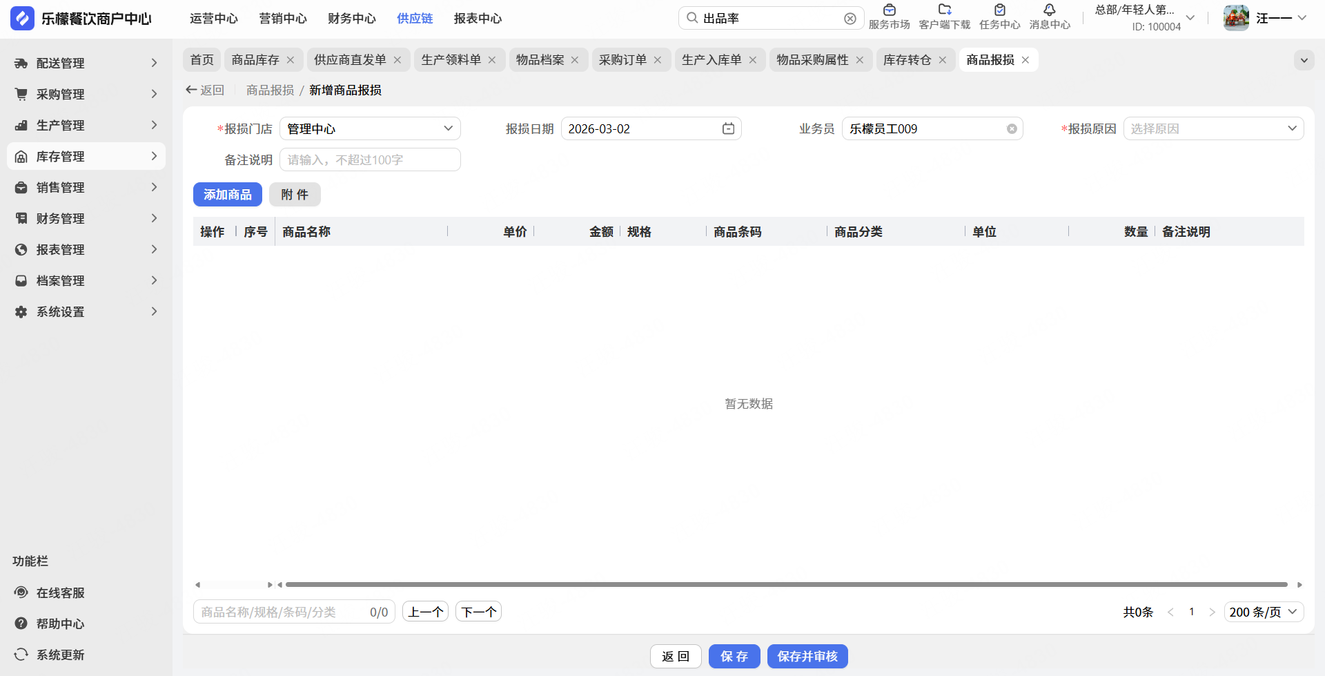 对于面包、果茶等商户,经常会出现损耗的情况,所以经常要对库存进行报损处理。