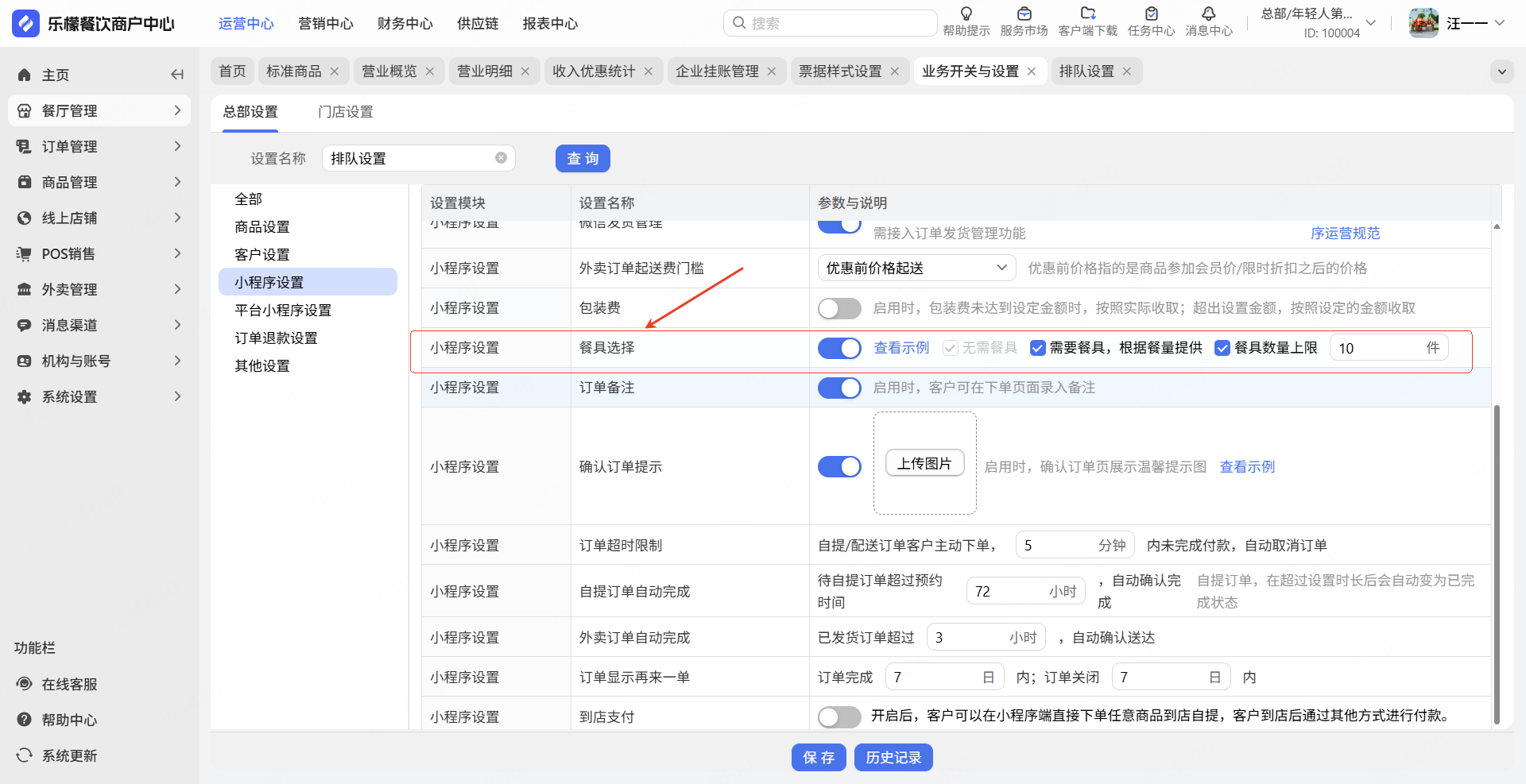 餐厅管理——业务开关与设置——小程序设置——餐具选择,勾选上启用餐具选择